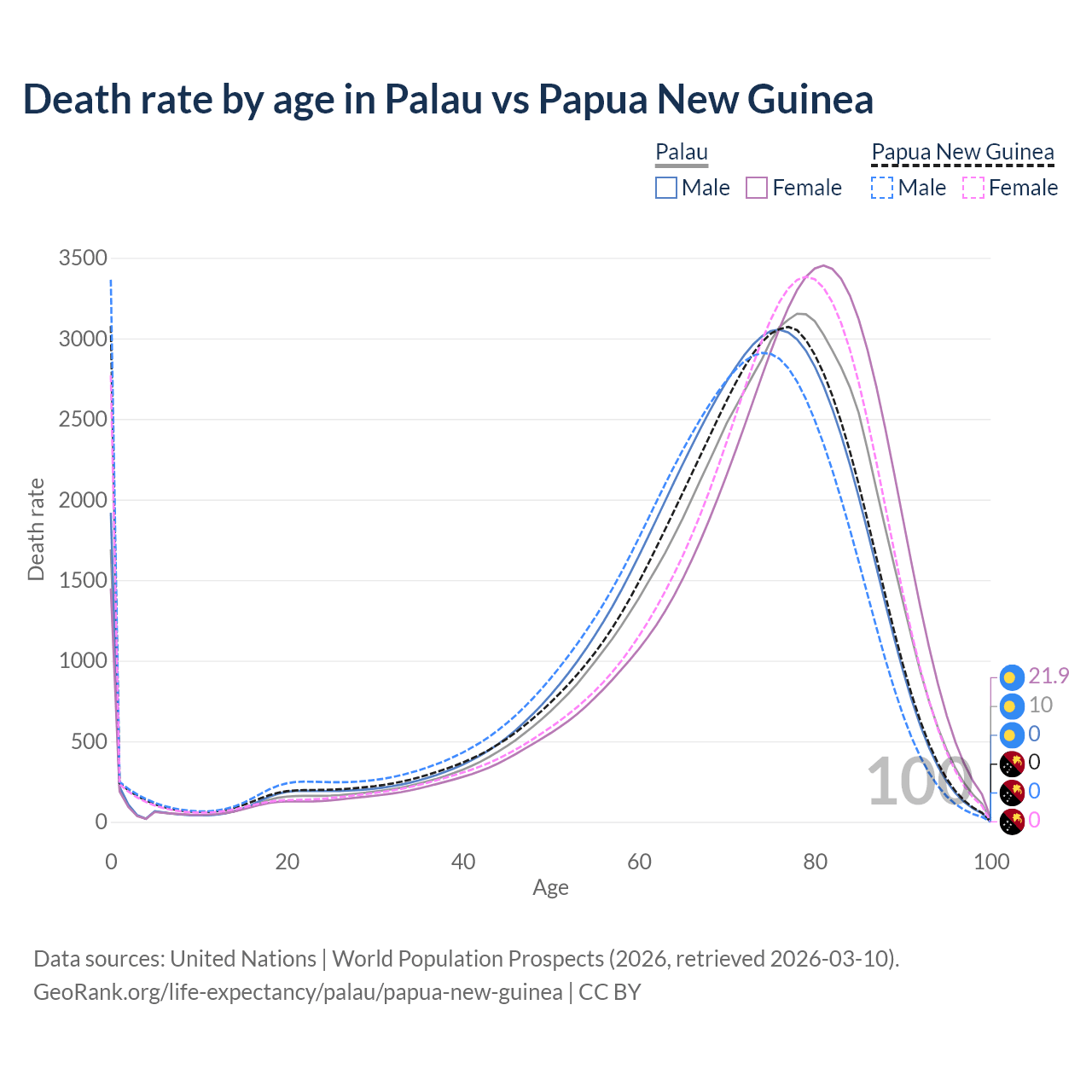 In Palau, the most common age of death is 78, compared to 0 in Papua New Guinea. The median age of death is 73.8 in Palau and 71.7 in Papua New Guinea, meaning only half of each cohort is expected to live past that age.