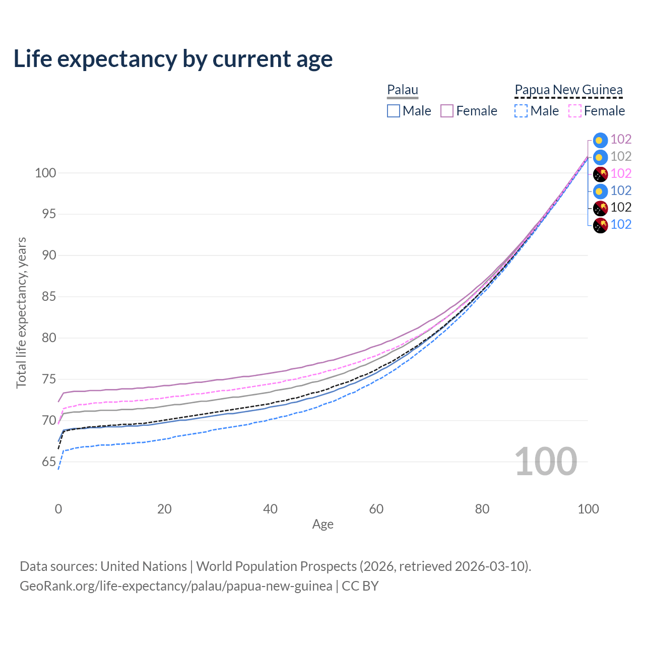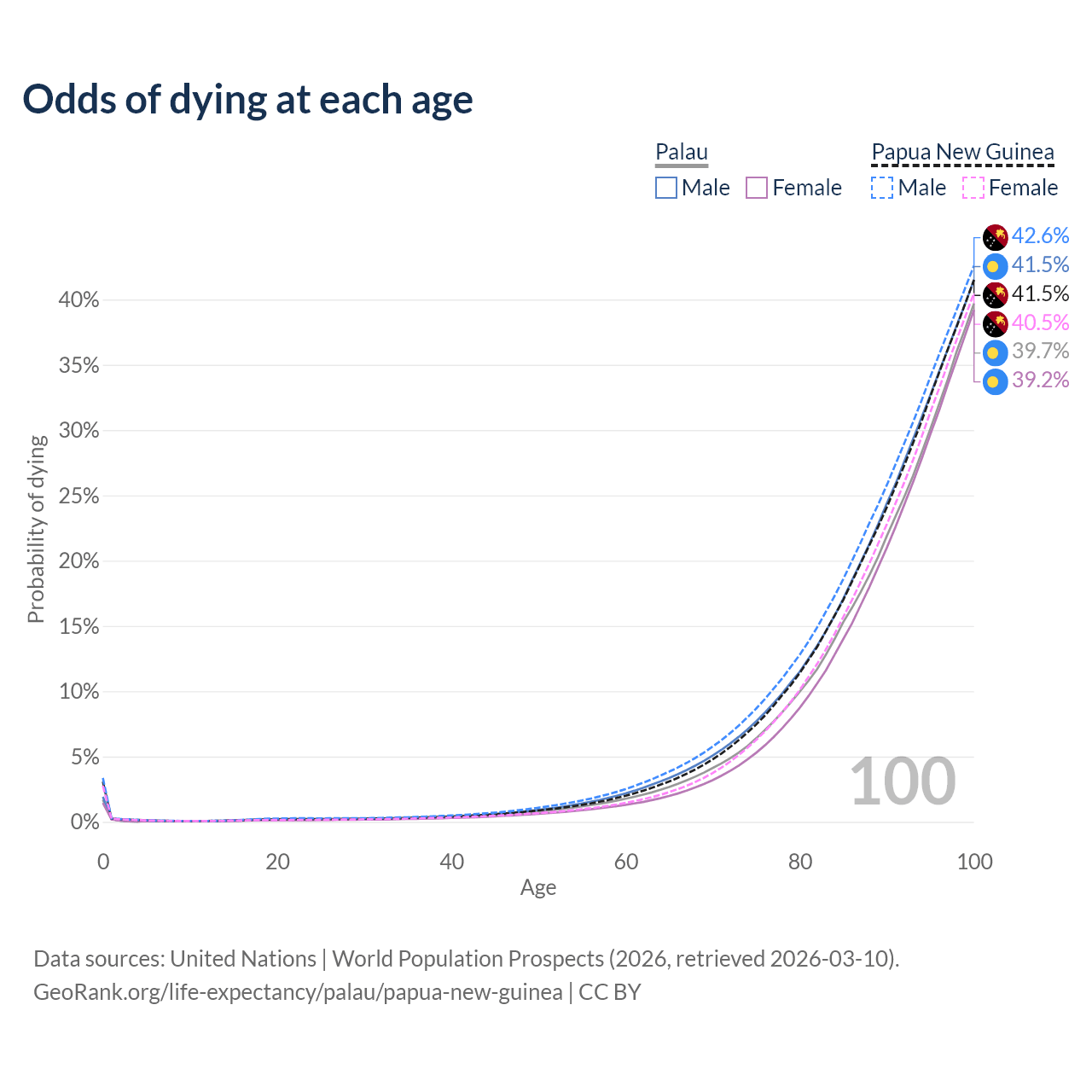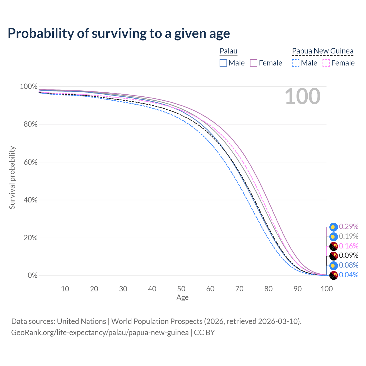This life expectancy calculator shows the odds of living to 100, 95, 90, and below based on current age for both males and females in Palau and Papua New Guinea, along with mean and median age of death. The calculations are based on the 2026 life tables (actuarial tables) from the UN World Population Prospects.