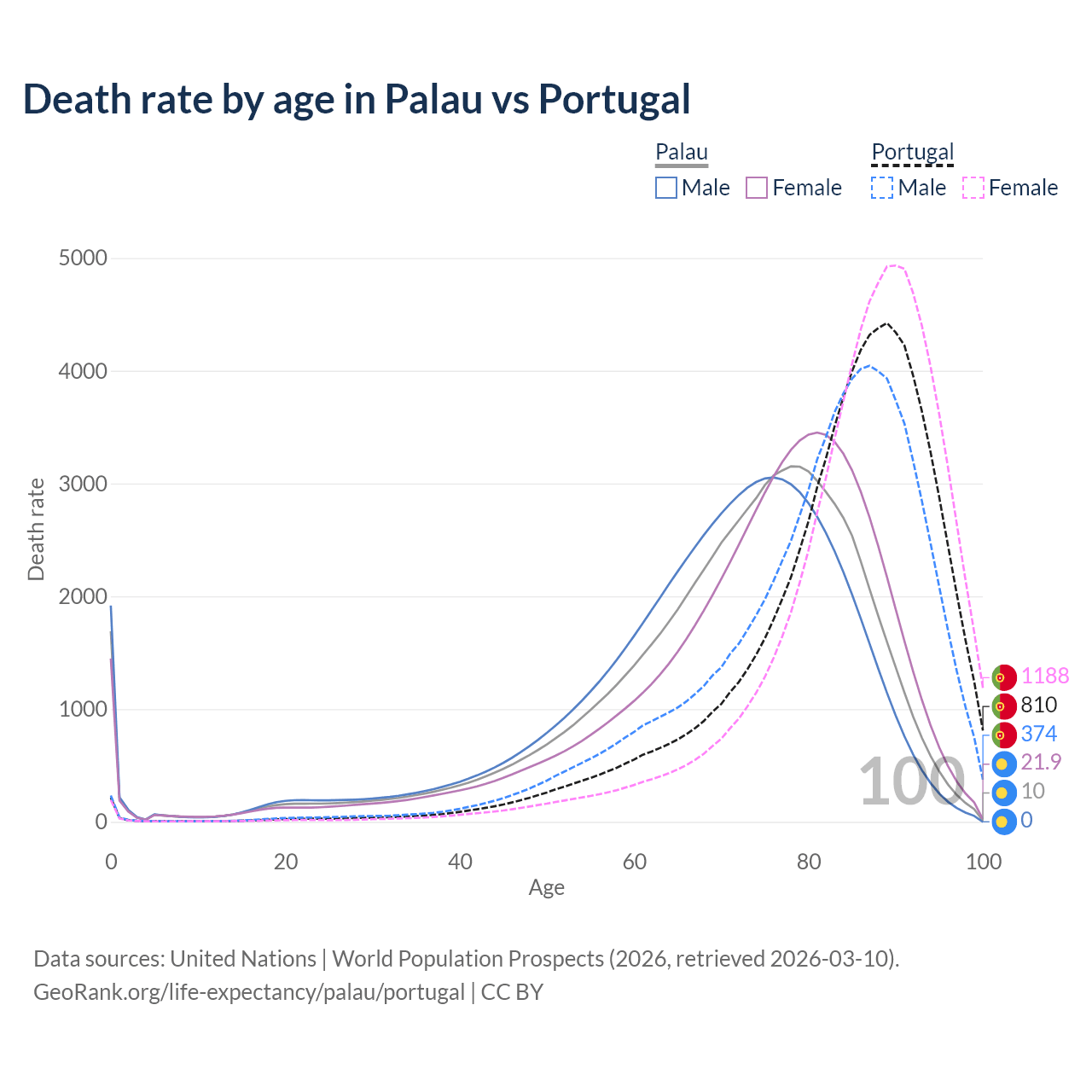 This life expectancy calculator shows the odds of living to 100, 95, 90, and below based on current age for both males and females in Palau and Portugal, along with mean and median age of death. The calculations are based on the 2026 life tables (actuarial tables) from the UN World Population Prospects.