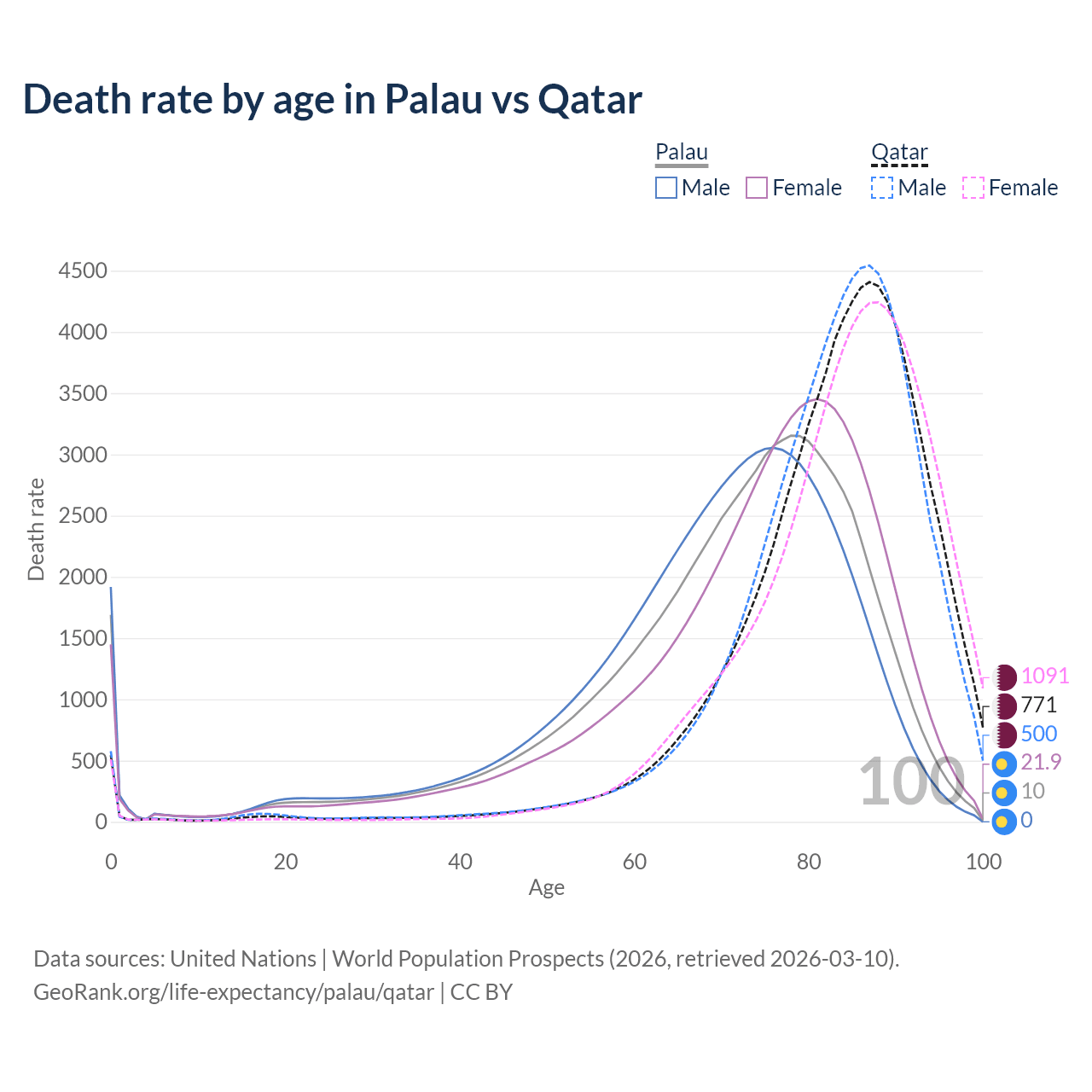 In Palau, the most common age of death is 78, compared to 87 in Qatar. The median age of death is 73.8 in Palau and 85.1 in Qatar, meaning only half of each cohort is expected to live past that age.