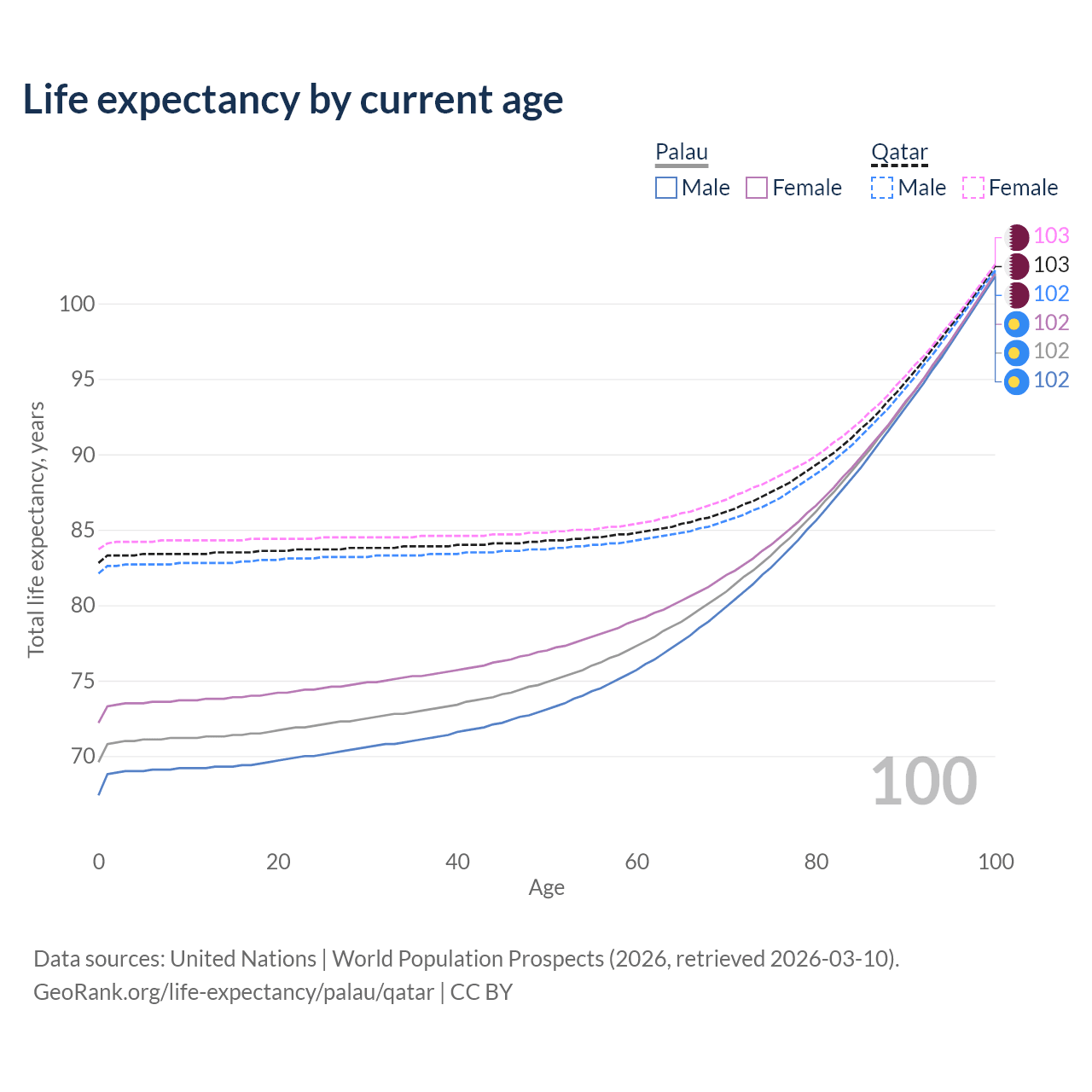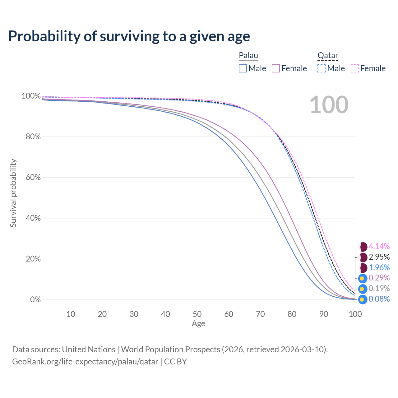 This life expectancy calculator shows the odds of living to 100, 95, 90, and below based on current age for both males and females in Palau and Qatar, along with mean and median age of death. The calculations are based on the 2026 life tables (actuarial tables) from the UN World Population Prospects.