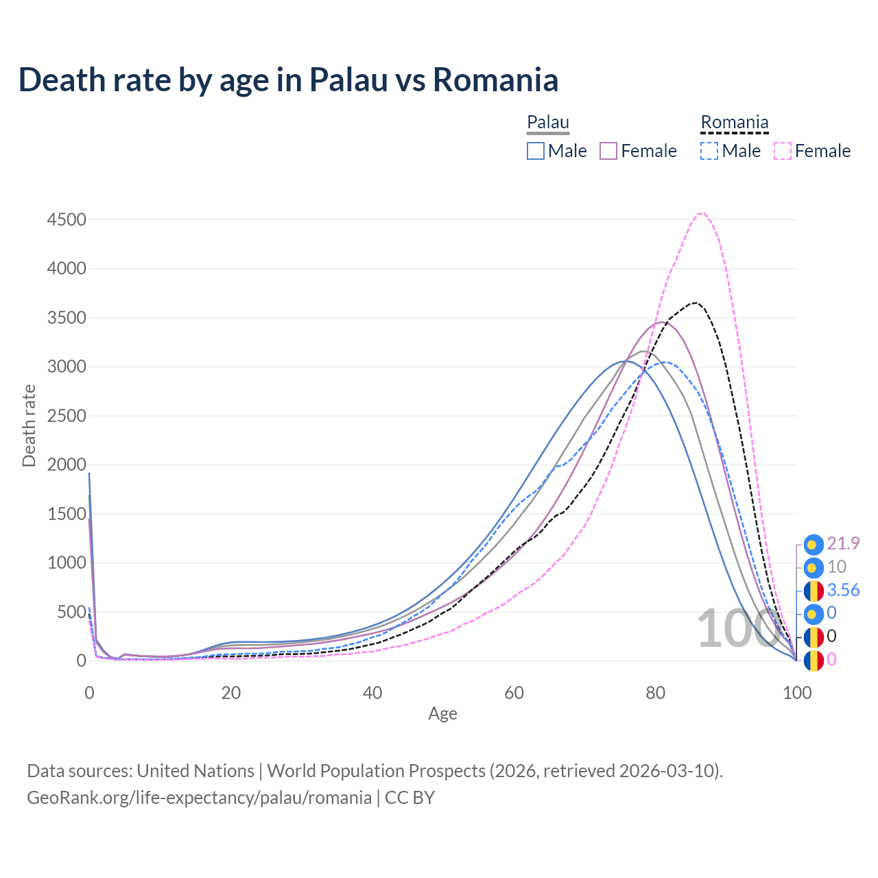 In Palau, the most common age of death is 78, compared to 86 in Romania. The median age of death is 73.8 in Palau and 79.9 in Romania, meaning only half of each cohort is expected to live past that age.