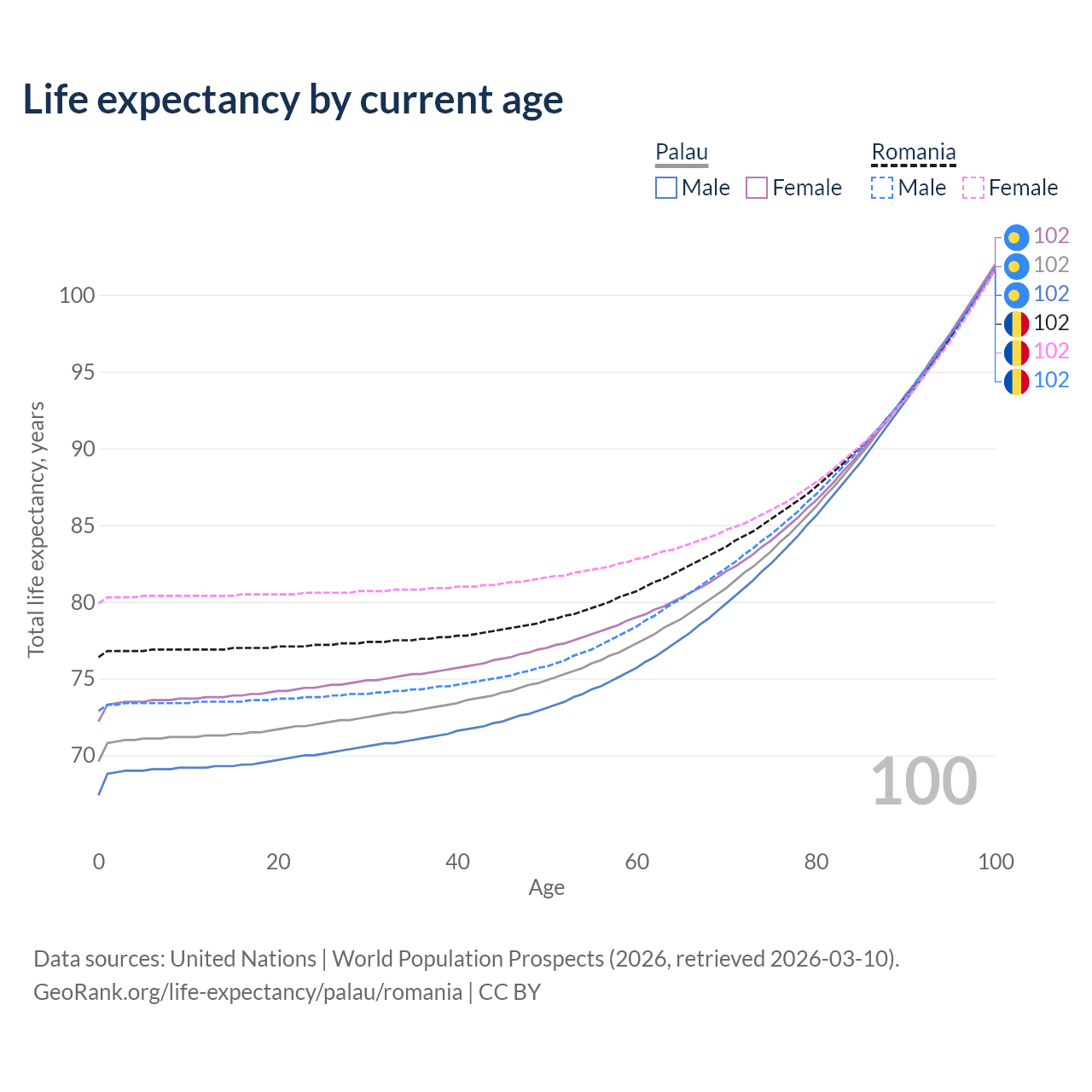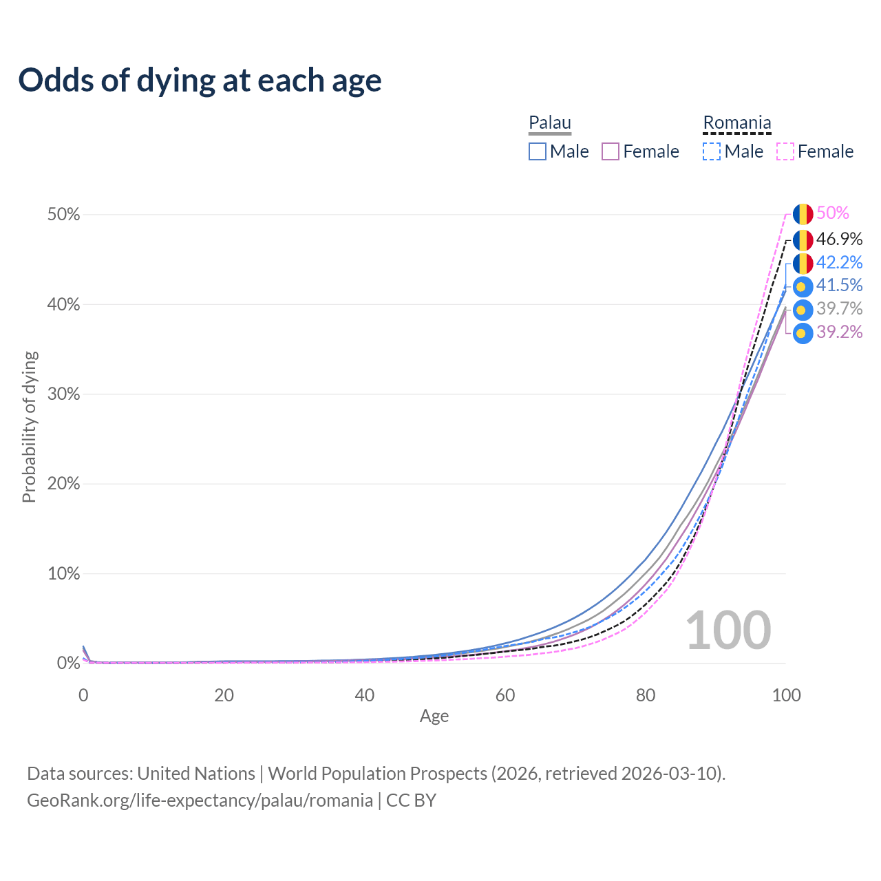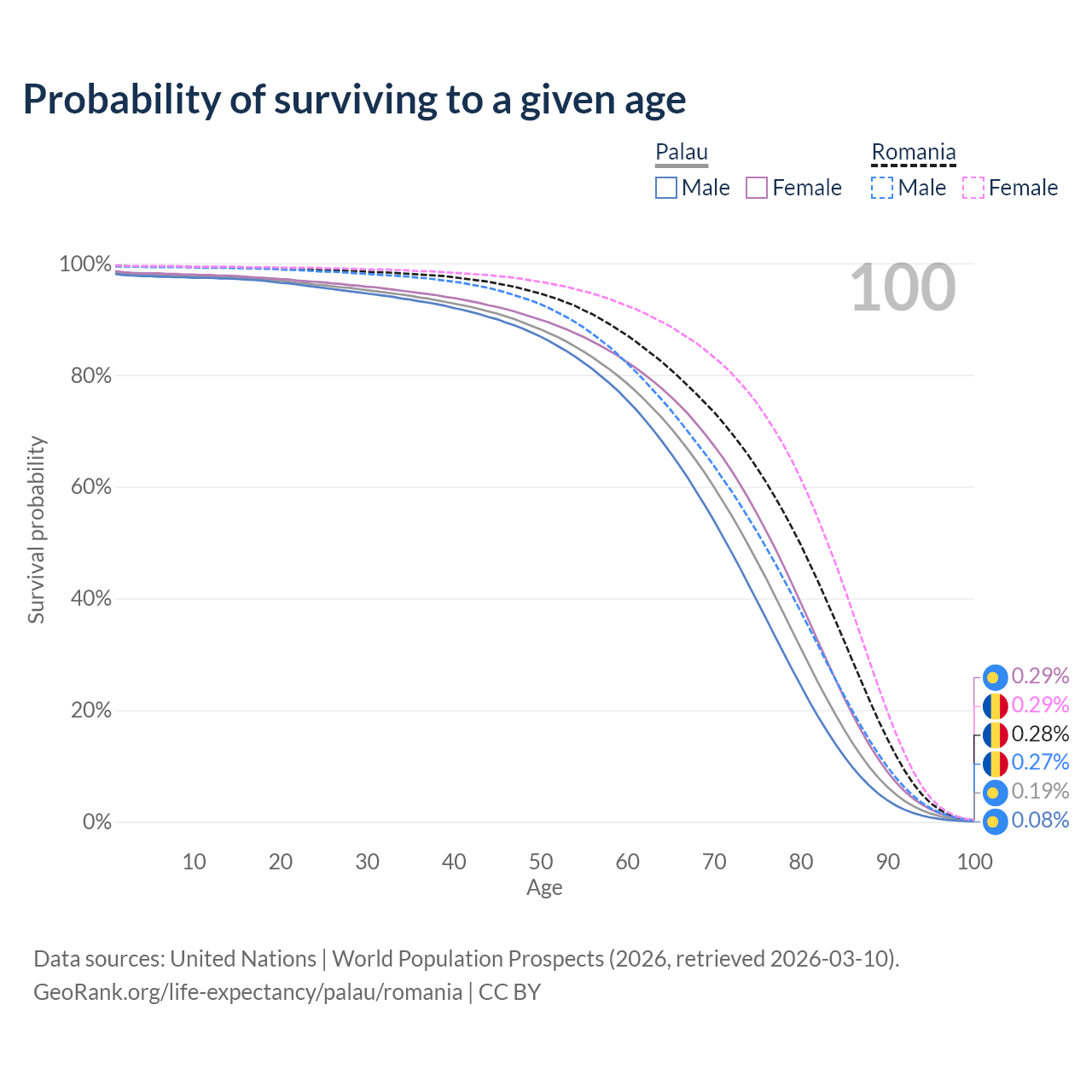 This life expectancy calculator shows the odds of living to 100, 95, 90, and below based on current age for both males and females in Palau and Romania, along with mean and median age of death. The calculations are based on the 2026 life tables (actuarial tables) from the UN World Population Prospects.