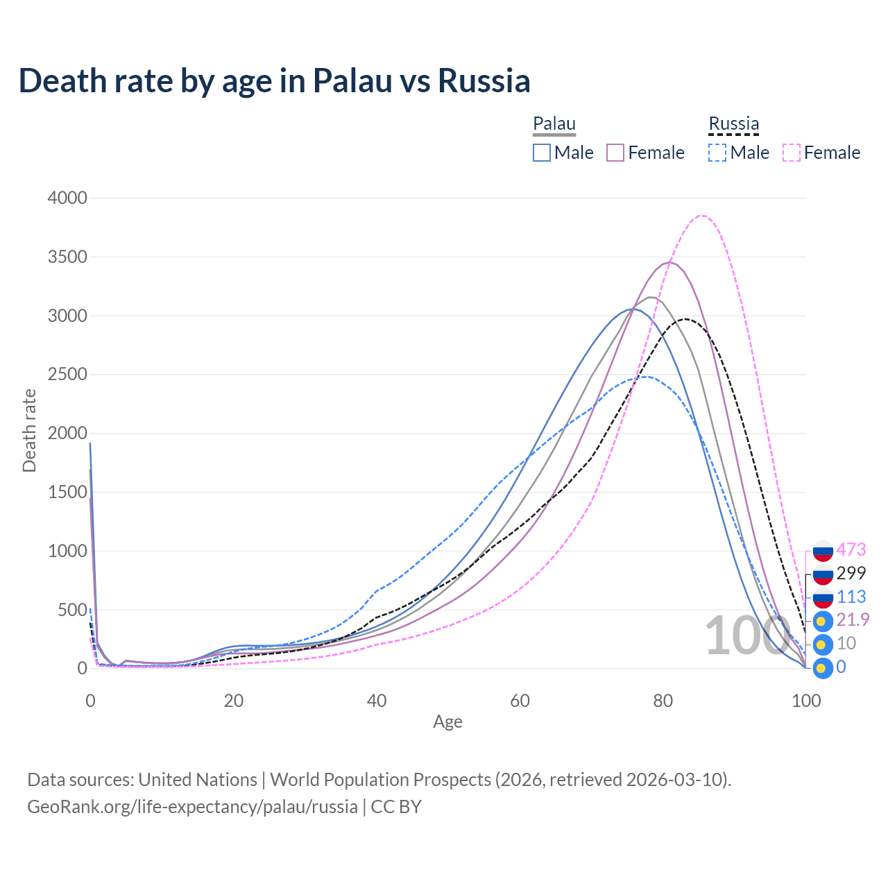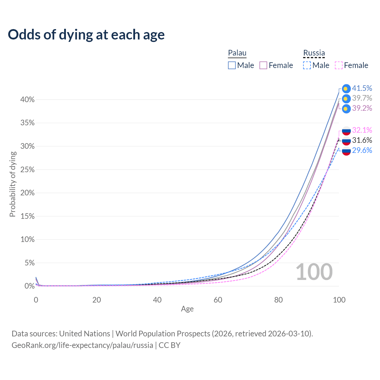 This life expectancy calculator shows the odds of living to 100, 95, 90, and below based on current age for both males and females in Palau and Russia, along with mean and median age of death. The calculations are based on the 2026 life tables (actuarial tables) from the UN World Population Prospects.