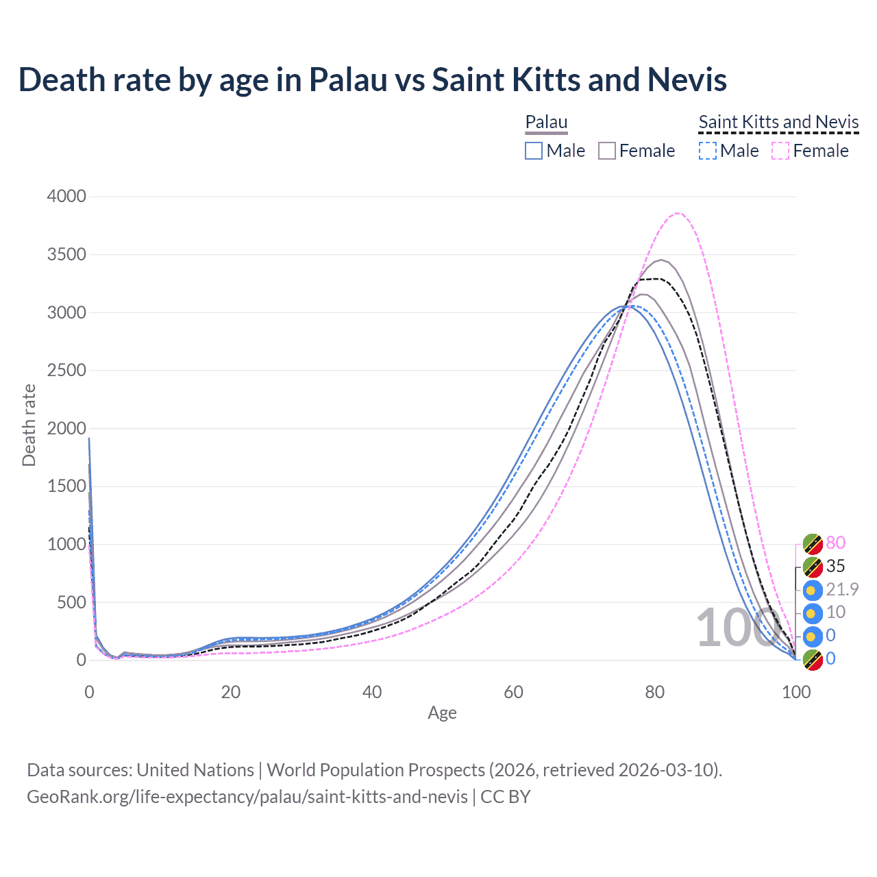 In Palau, the most common age of death is 78, compared to 80 in Saint Kitts and Nevis. The median age of death is 73.8 in Palau and 76.3 in Saint Kitts and Nevis, meaning only half of each cohort is expected to live past that age.