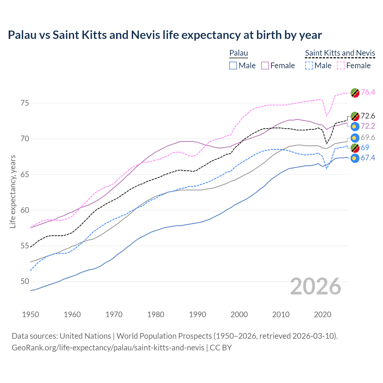Palau vs Saint Kitts and Nevis life expectancy at birth by year
