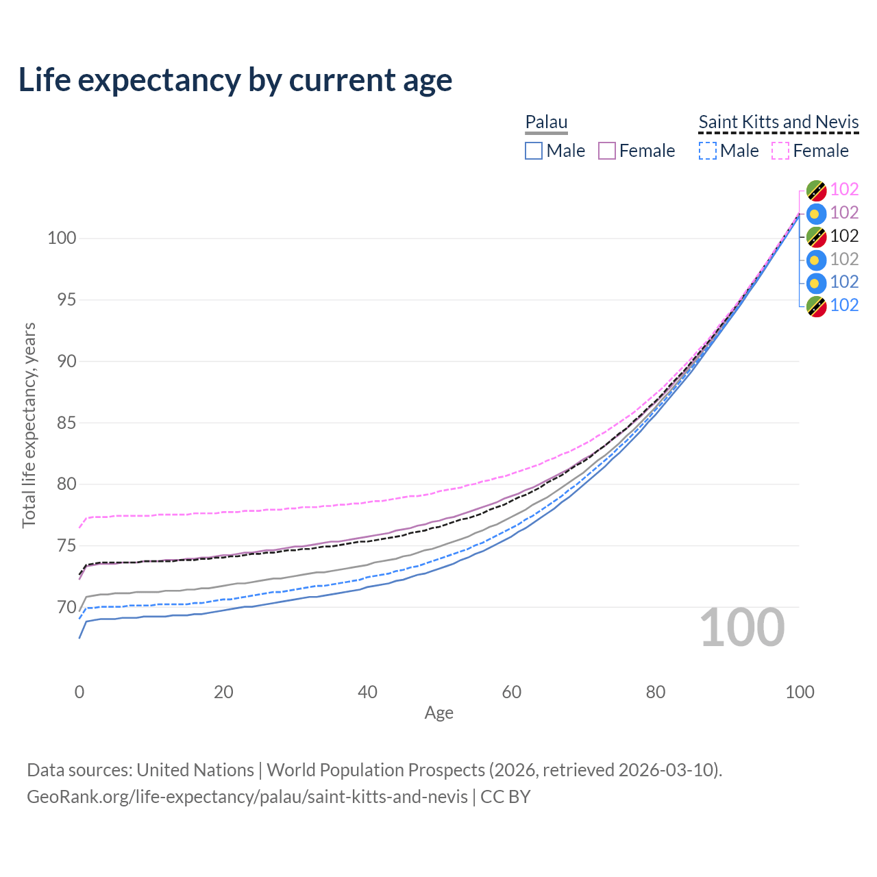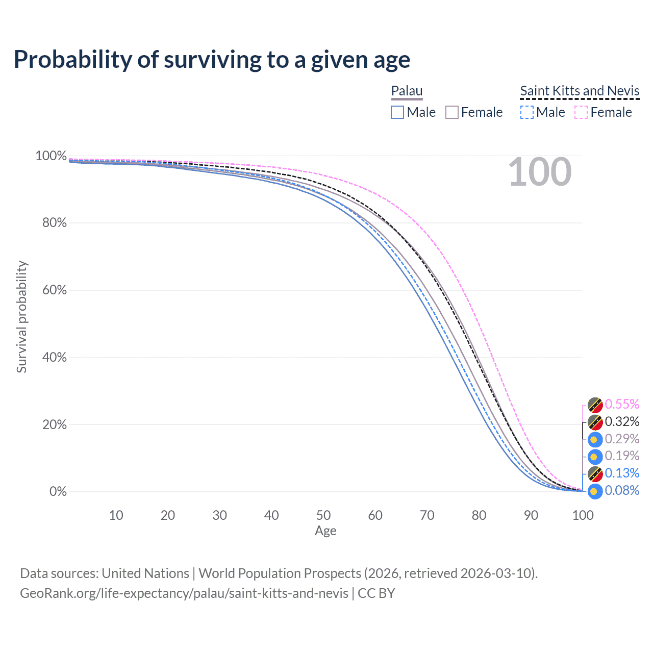 This life expectancy calculator shows the odds of living to 100, 95, 90, and below based on current age for both males and females in Palau and Saint Kitts and Nevis, along with mean and median age of death. The calculations are based on the 2026 life tables (actuarial tables) from the UN World Population Prospects.