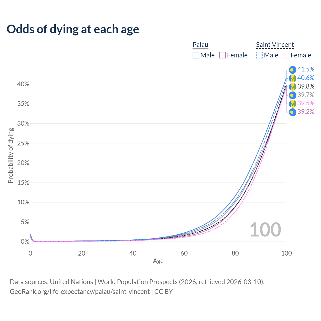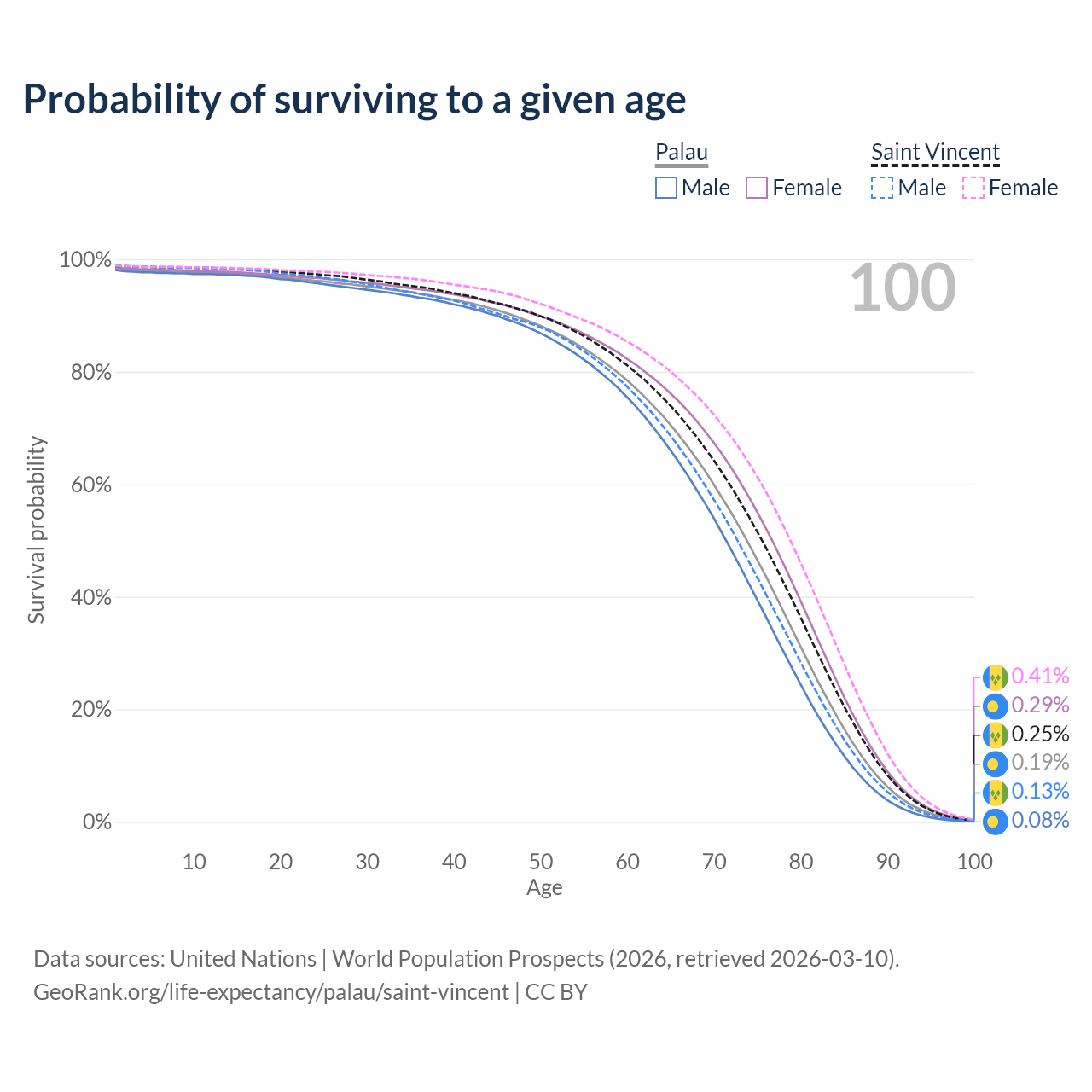 This life expectancy calculator shows the odds of living to 100, 95, 90, and below based on current age for both males and females in Palau and Saint Vincent, along with mean and median age of death. The calculations are based on the 2026 life tables (actuarial tables) from the UN World Population Prospects.