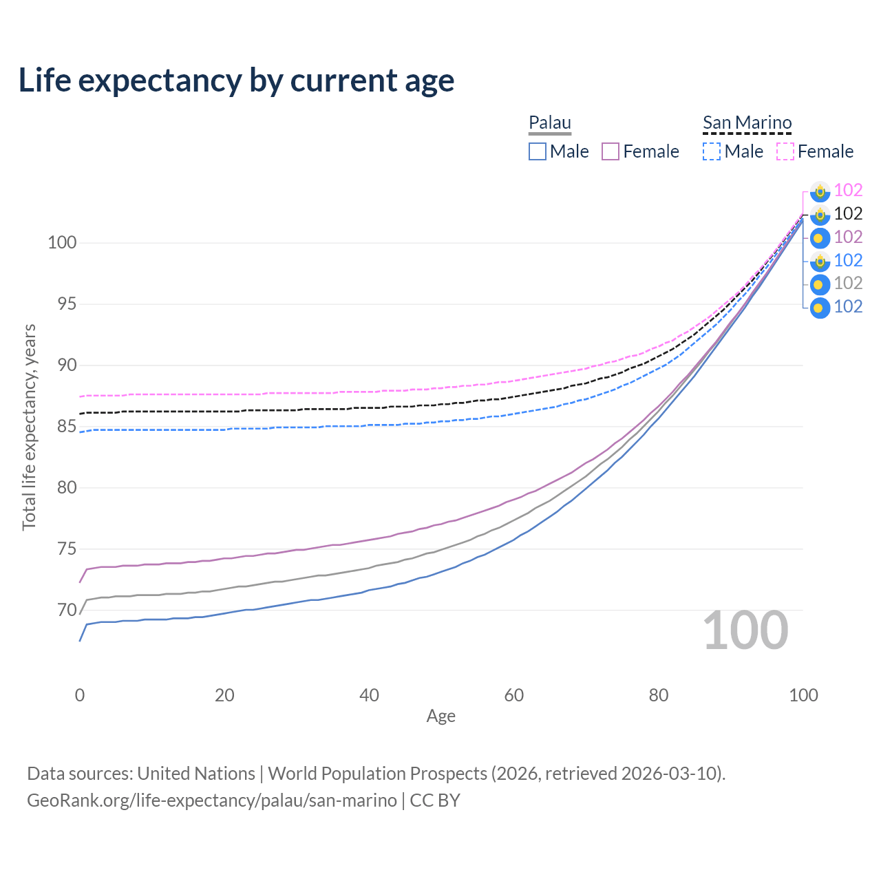 This life expectancy calculator shows the odds of living to 100, 95, 90, and below based on current age for both males and females in Palau and San Marino, along with mean and median age of death. The calculations are based on the 2026 life tables (actuarial tables) from the UN World Population Prospects.