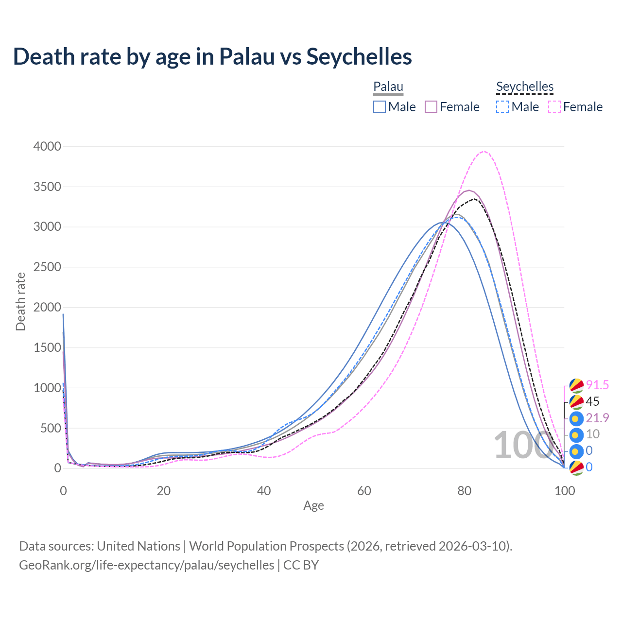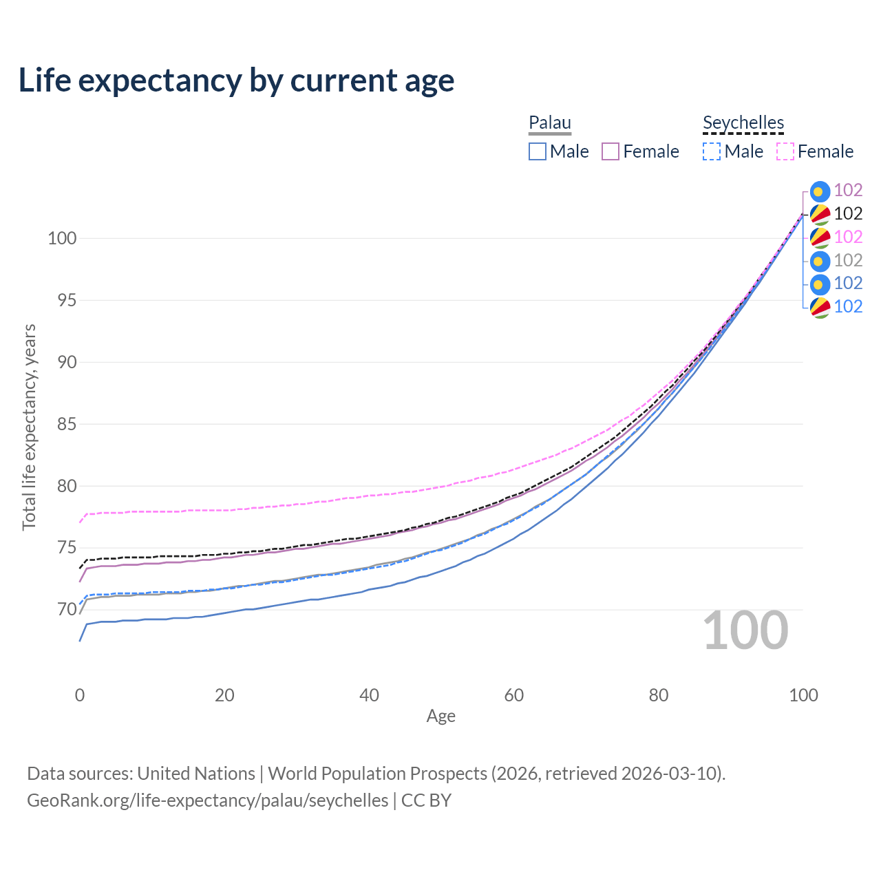 This life expectancy calculator shows the odds of living to 100, 95, 90, and below based on current age for both males and females in Palau and the Seychelles, along with mean and median age of death. The calculations are based on the 2026 life tables (actuarial tables) from the UN World Population Prospects.