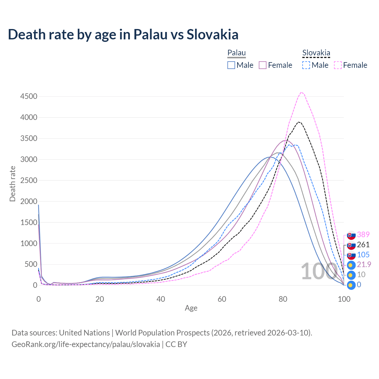 In Palau, the most common age of death is 78, compared to 85 in Slovakia. The median age of death is 73.8 in Palau and 82 in Slovakia, meaning only half of each cohort is expected to live past that age.