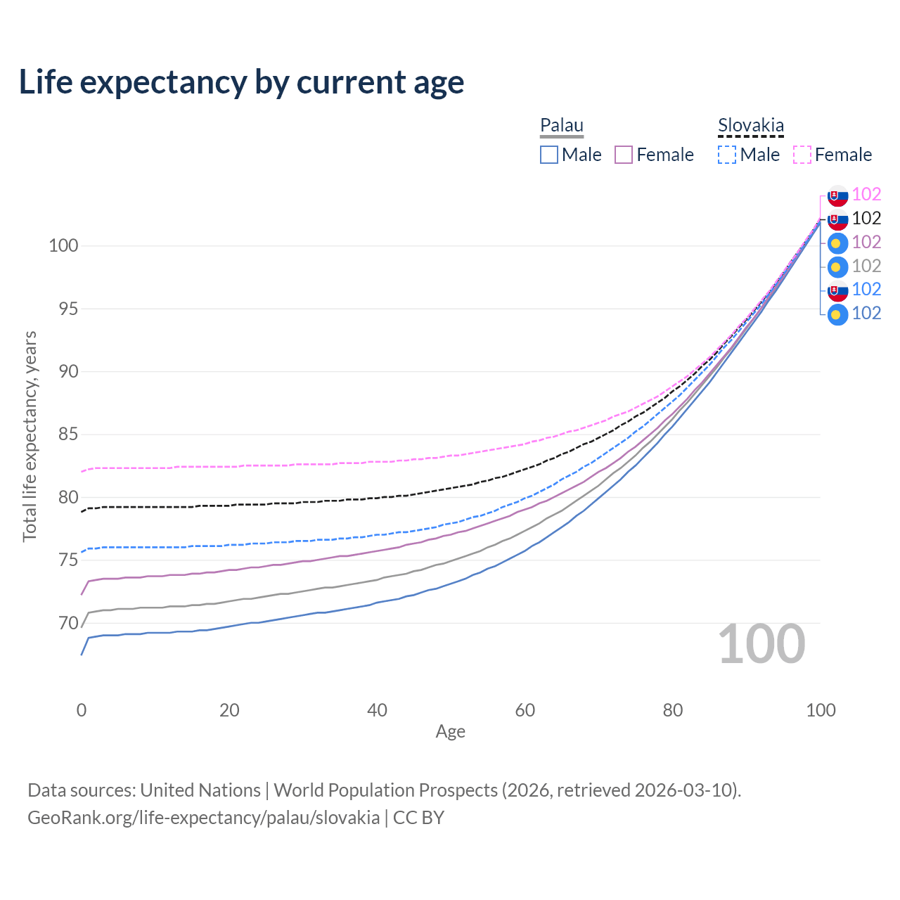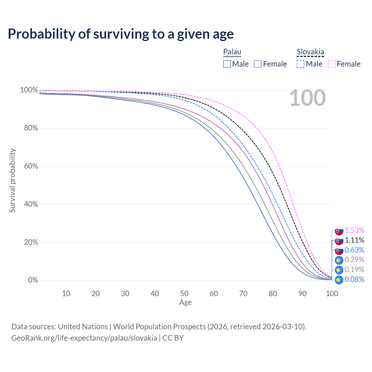 This life expectancy calculator shows the odds of living to 100, 95, 90, and below based on current age for both males and females in Palau and Slovakia, along with mean and median age of death. The calculations are based on the 2026 life tables (actuarial tables) from the UN World Population Prospects.