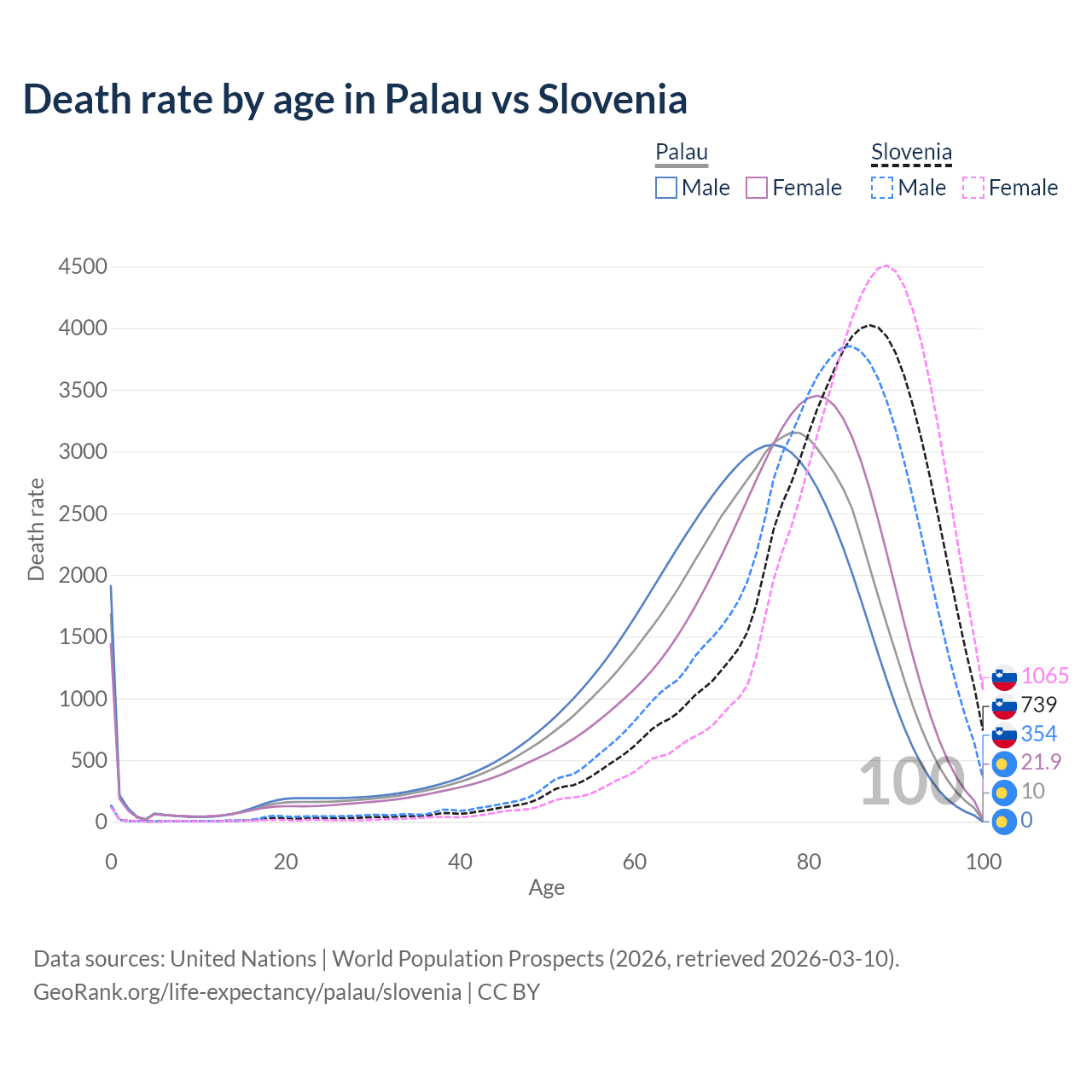 In Palau, the most common age of death is 78, compared to 87 in Slovenia. The median age of death is 73.8 in Palau and 84.4 in Slovenia, meaning only half of each cohort is expected to live past that age.