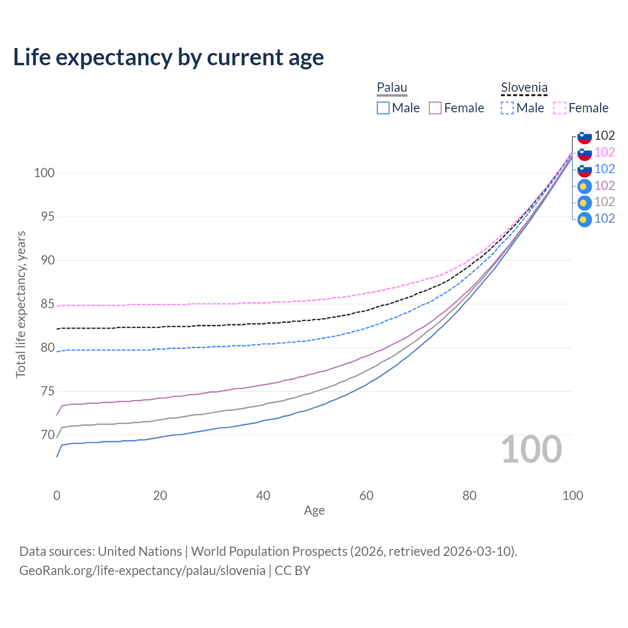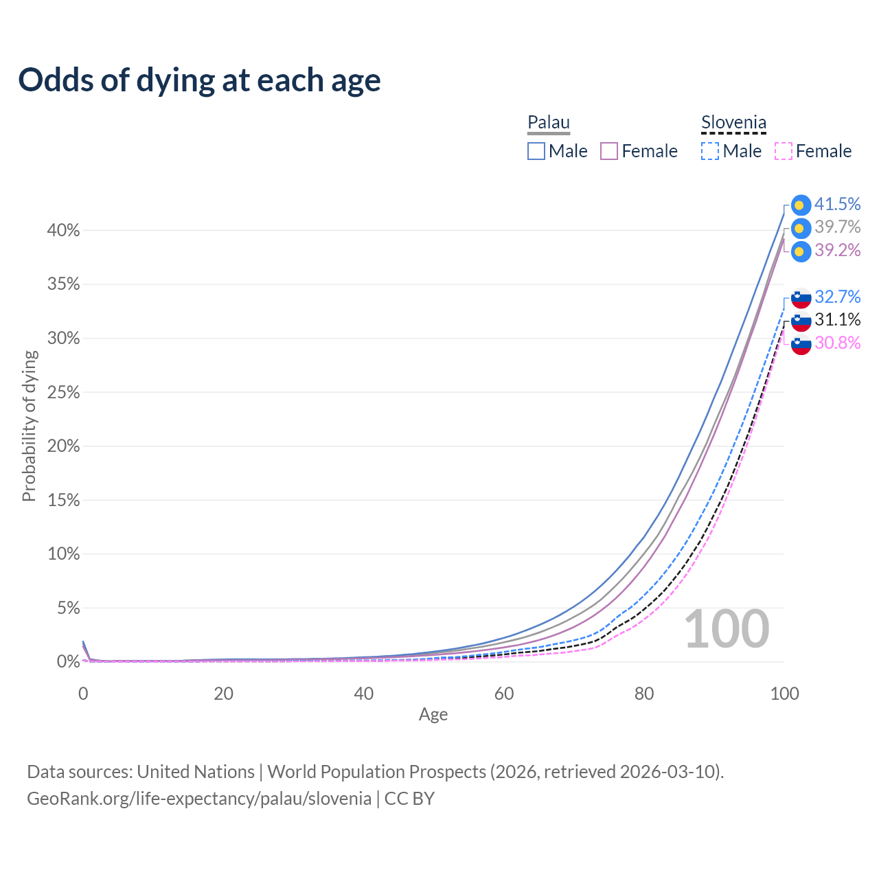 This life expectancy calculator shows the odds of living to 100, 95, 90, and below based on current age for both males and females in Palau and Slovenia, along with mean and median age of death. The calculations are based on the 2026 life tables (actuarial tables) from the UN World Population Prospects.