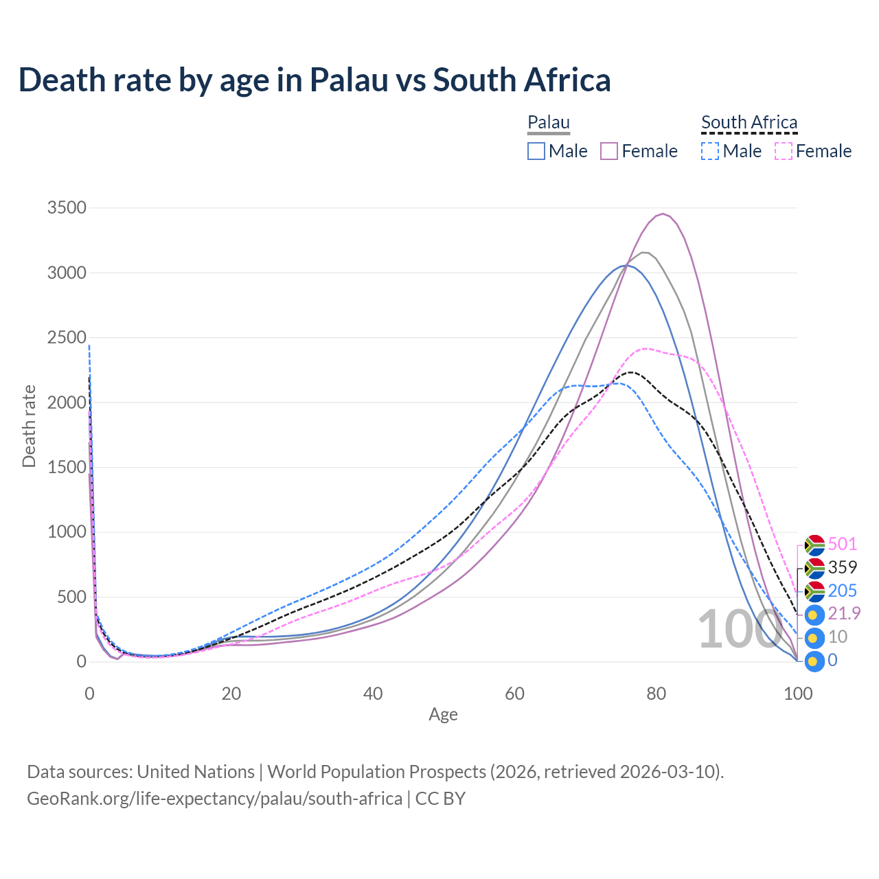 In Palau, the most common age of death is 78, compared to 77 in South Africa. The median age of death is 73.8 in Palau and 70.8 in South Africa, meaning only half of each cohort is expected to live past that age.