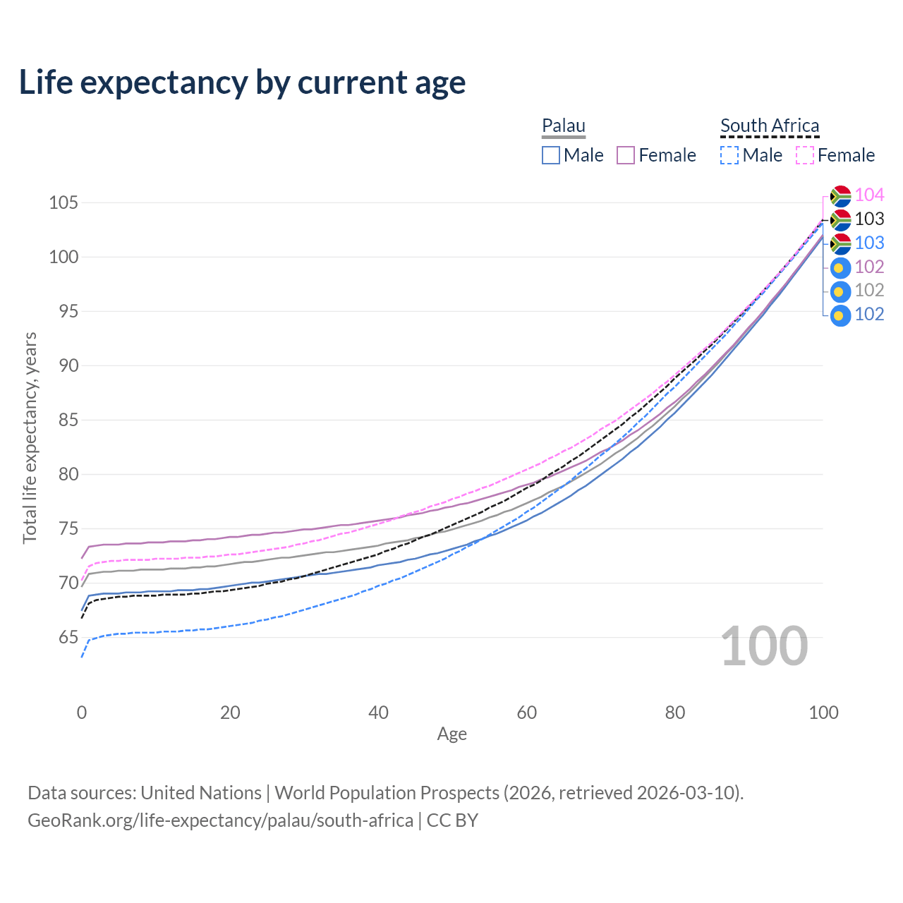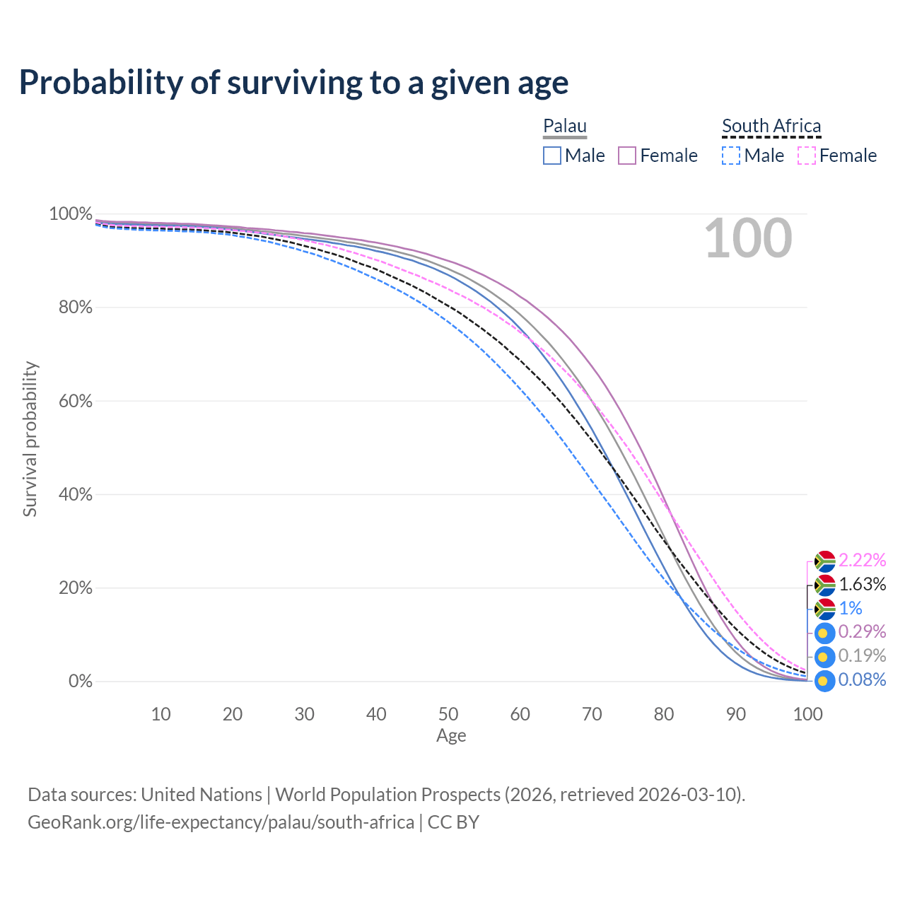 This life expectancy calculator shows the odds of living to 100, 95, 90, and below based on current age for both males and females in Palau and South Africa, along with mean and median age of death. The calculations are based on the 2026 life tables (actuarial tables) from the UN World Population Prospects.