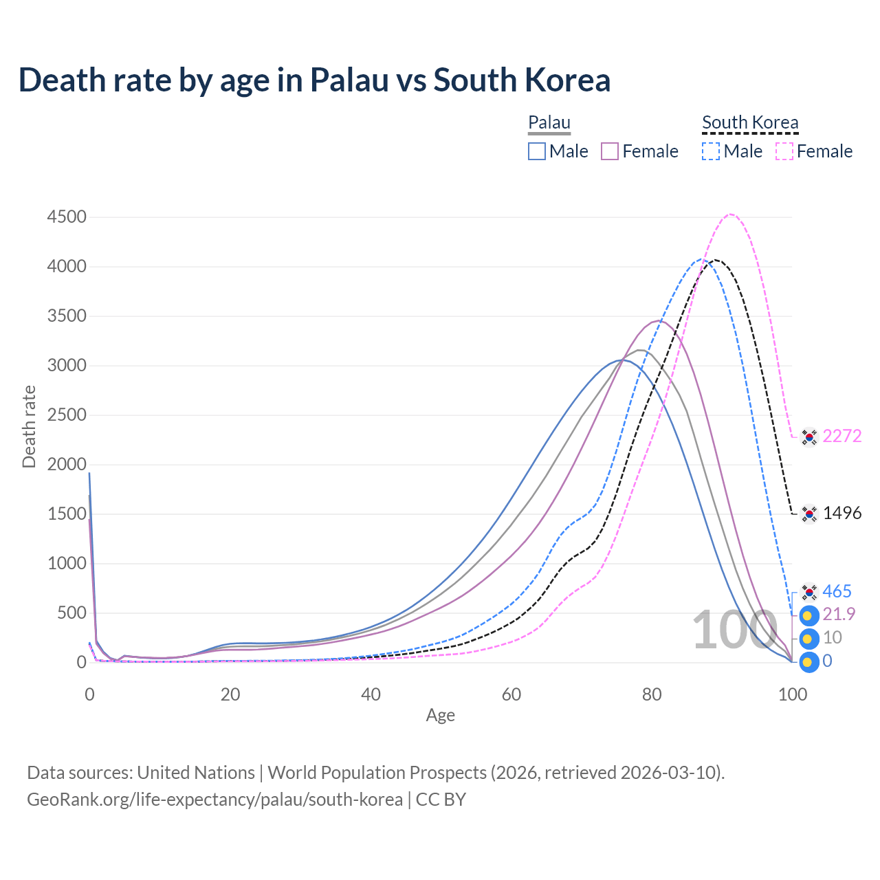 In Palau, the most common age of death is 78, compared to 89 in South Korea. The median age of death is 73.8 in Palau and 86.8 in South Korea, meaning only half of each cohort is expected to live past that age.