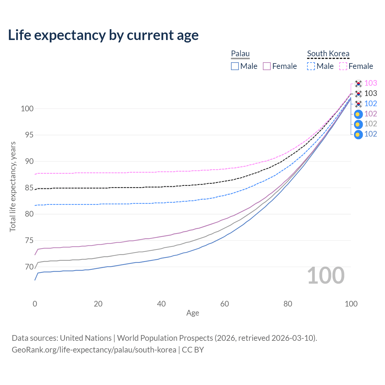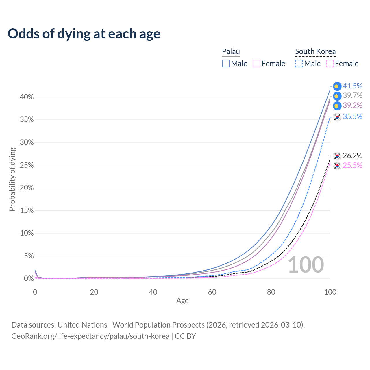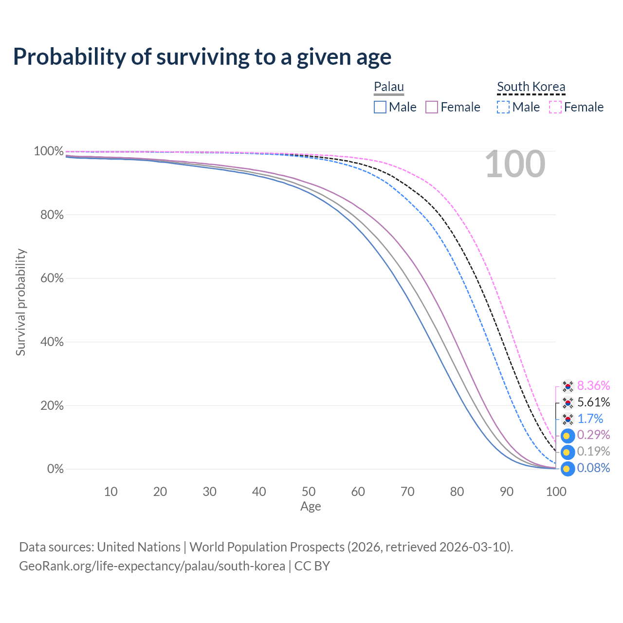 This life expectancy calculator shows the odds of living to 100, 95, 90, and below based on current age for both males and females in Palau and South Korea, along with mean and median age of death. The calculations are based on the 2026 life tables (actuarial tables) from the UN World Population Prospects.