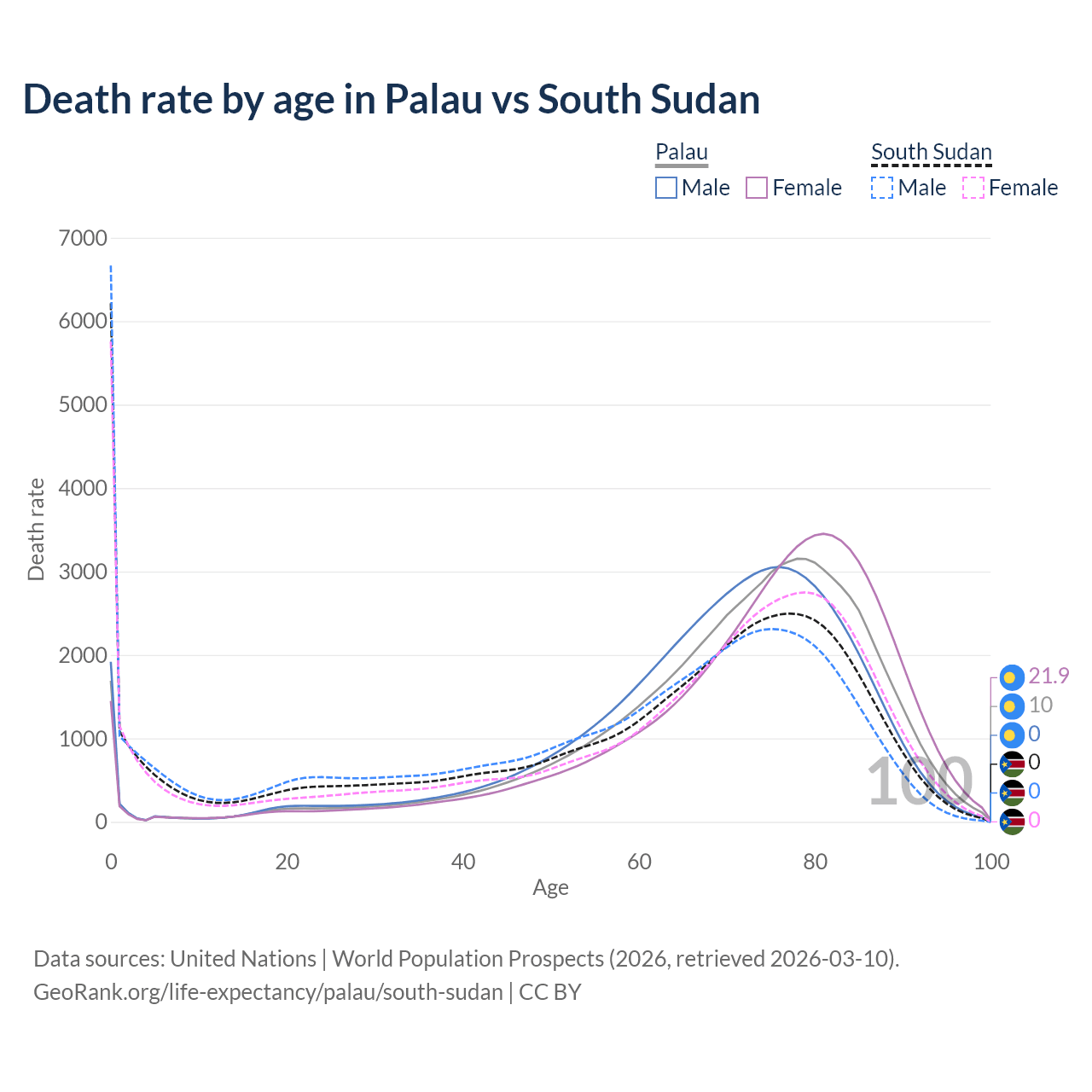 In Palau, the most common age of death is 78, compared to 0 in South Sudan. The median age of death is 73.8 in Palau and 67.5 in South Sudan, meaning only half of each cohort is expected to live past that age.
