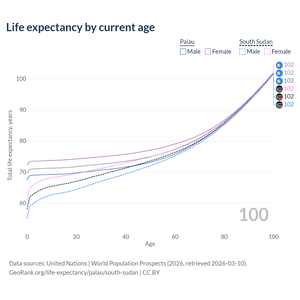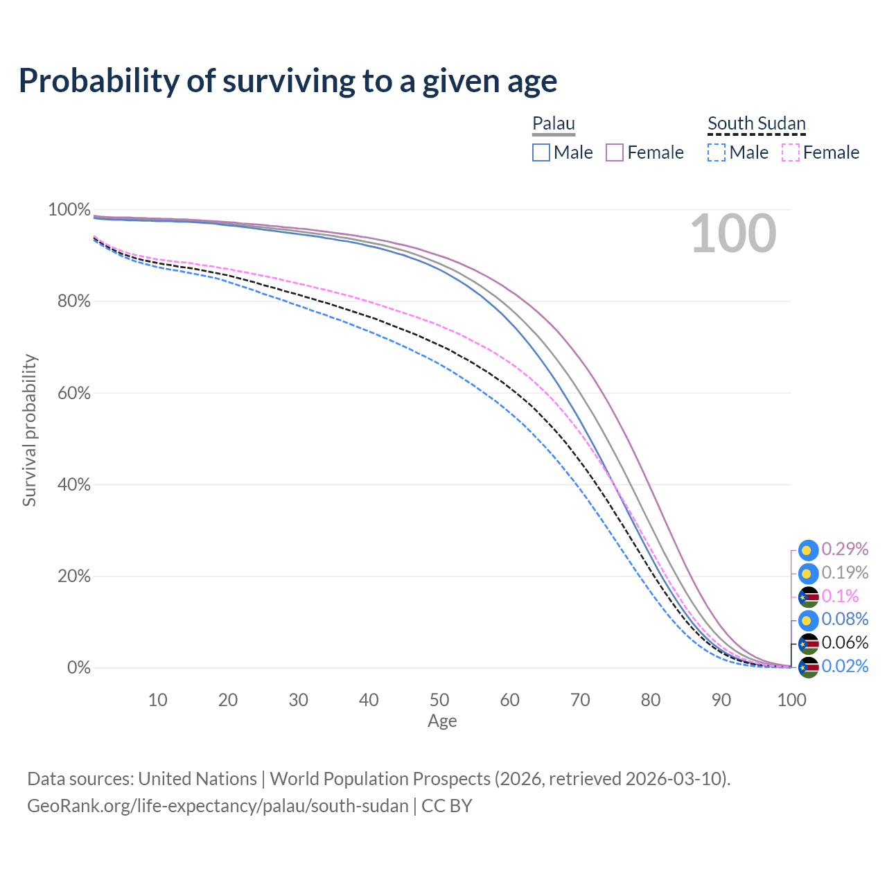 This life expectancy calculator shows the odds of living to 100, 95, 90, and below based on current age for both males and females in Palau and South Sudan, along with mean and median age of death. The calculations are based on the 2026 life tables (actuarial tables) from the UN World Population Prospects.