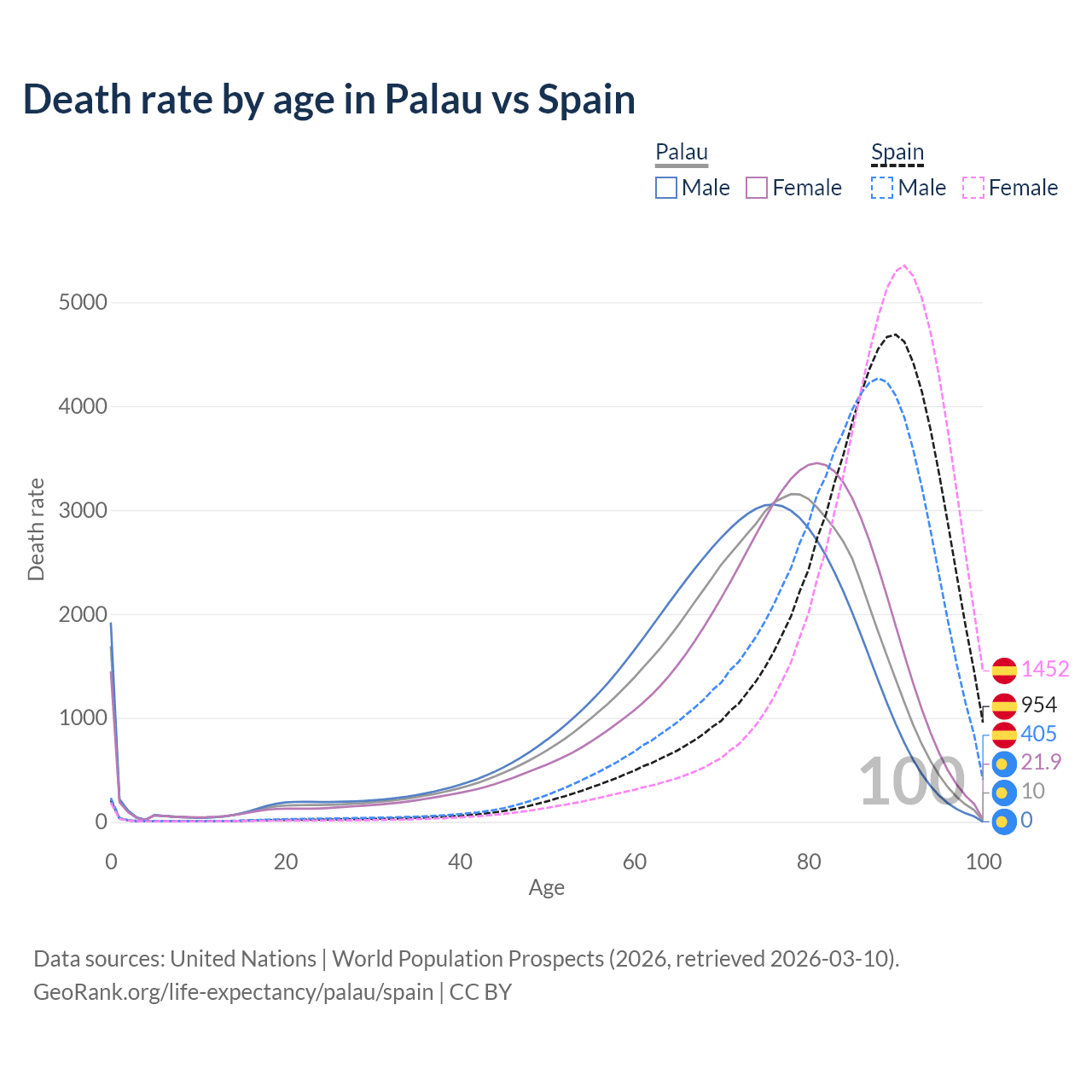 In Palau, the most common age of death is 78, compared to 90 in Spain. The median age of death is 73.8 in Palau and 87 in Spain, meaning only half of each cohort is expected to live past that age.