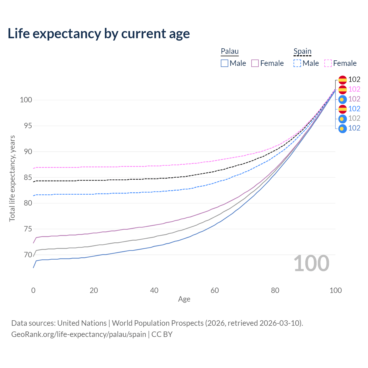 This life expectancy calculator shows the odds of living to 100, 95, 90, and below based on current age for both males and females in Palau and Spain, along with mean and median age of death. The calculations are based on the 2026 life tables (actuarial tables) from the UN World Population Prospects.