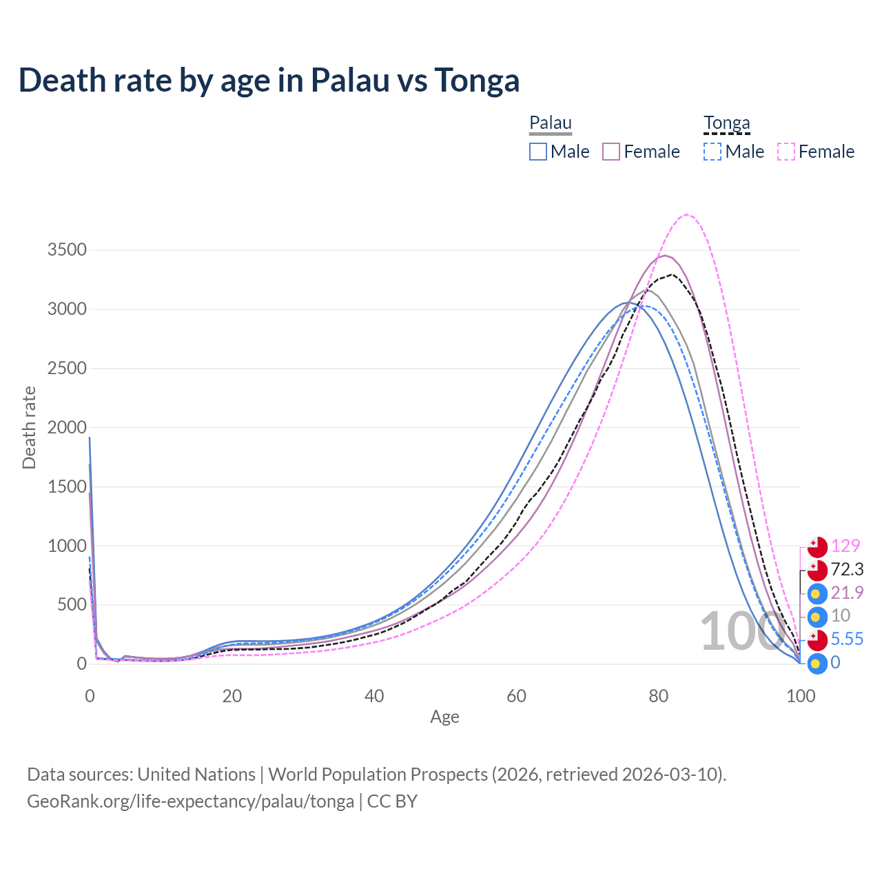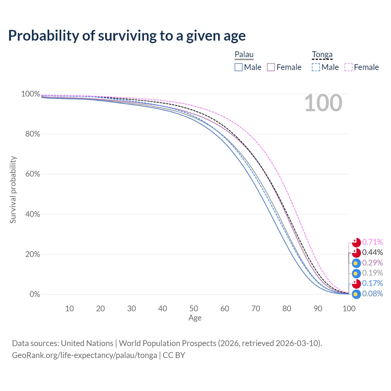 This life expectancy calculator shows the odds of living to 100, 95, 90, and below based on current age for both males and females in Palau and Tonga, along with mean and median age of death. The calculations are based on the 2026 life tables (actuarial tables) from the UN World Population Prospects.