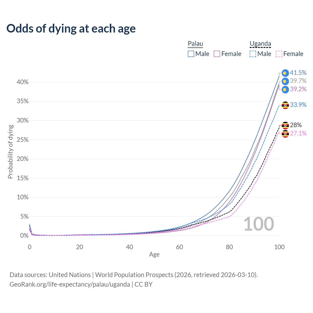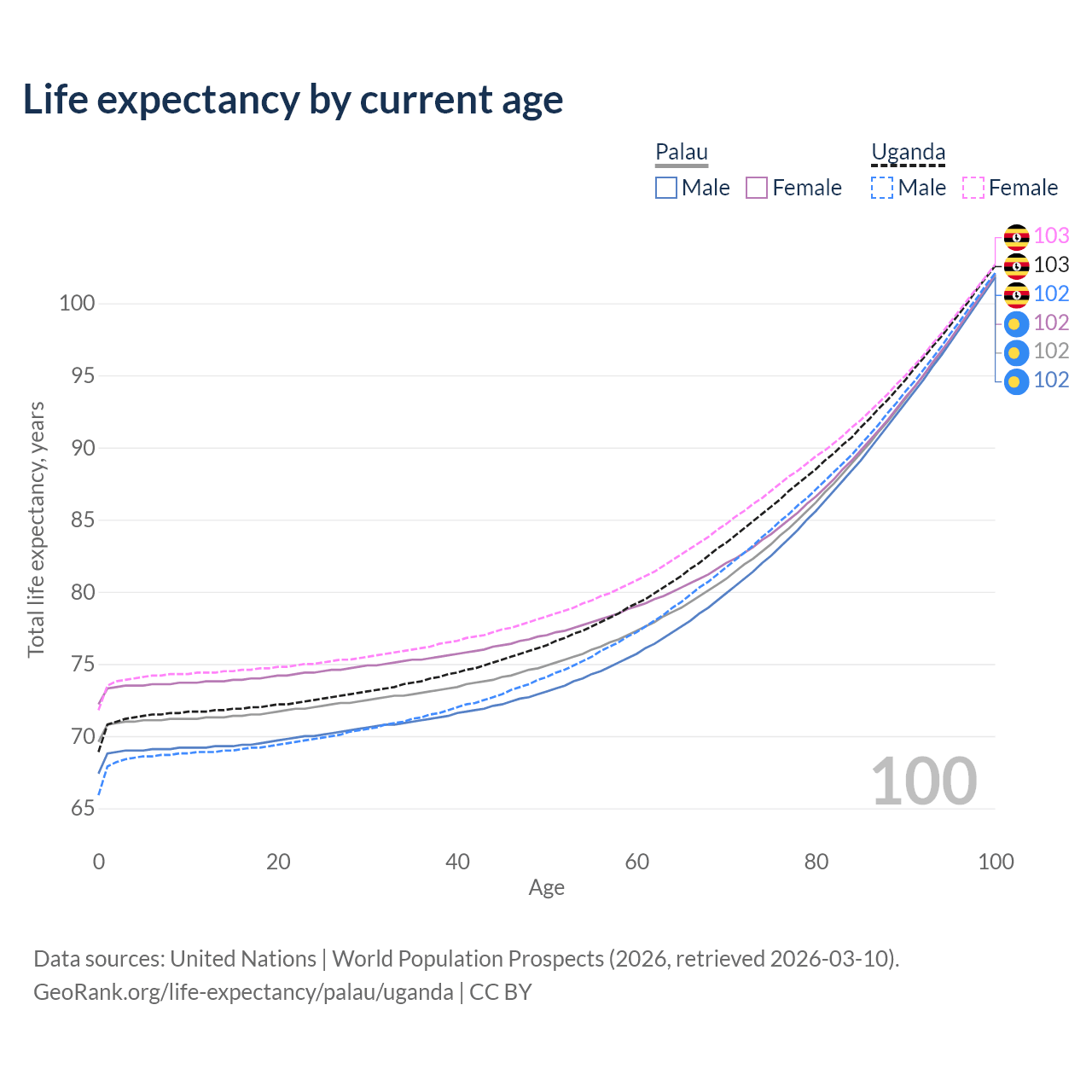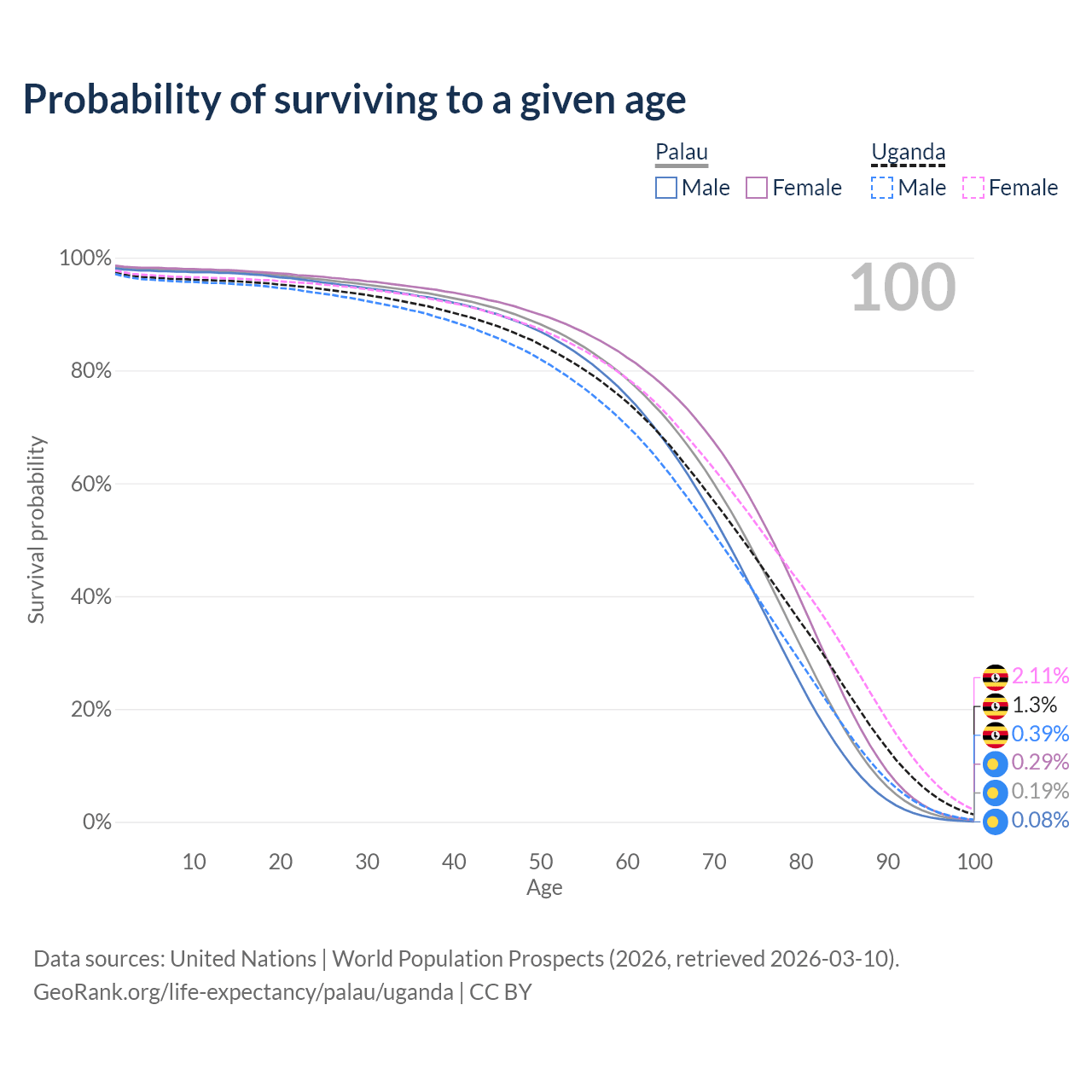This life expectancy calculator shows the odds of living to 100, 95, 90, and below based on current age for both males and females in Palau and Uganda, along with mean and median age of death. The calculations are based on the 2026 life tables (actuarial tables) from the UN World Population Prospects.