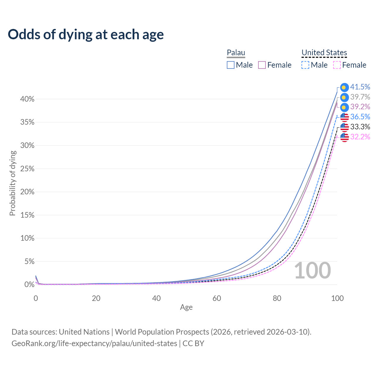 This life expectancy calculator shows the odds of living to 100, 95, 90, and below based on current age for both males and females in Palau and the United States, along with mean and median age of death. The calculations are based on the 2026 life tables (actuarial tables) from the UN World Population Prospects.