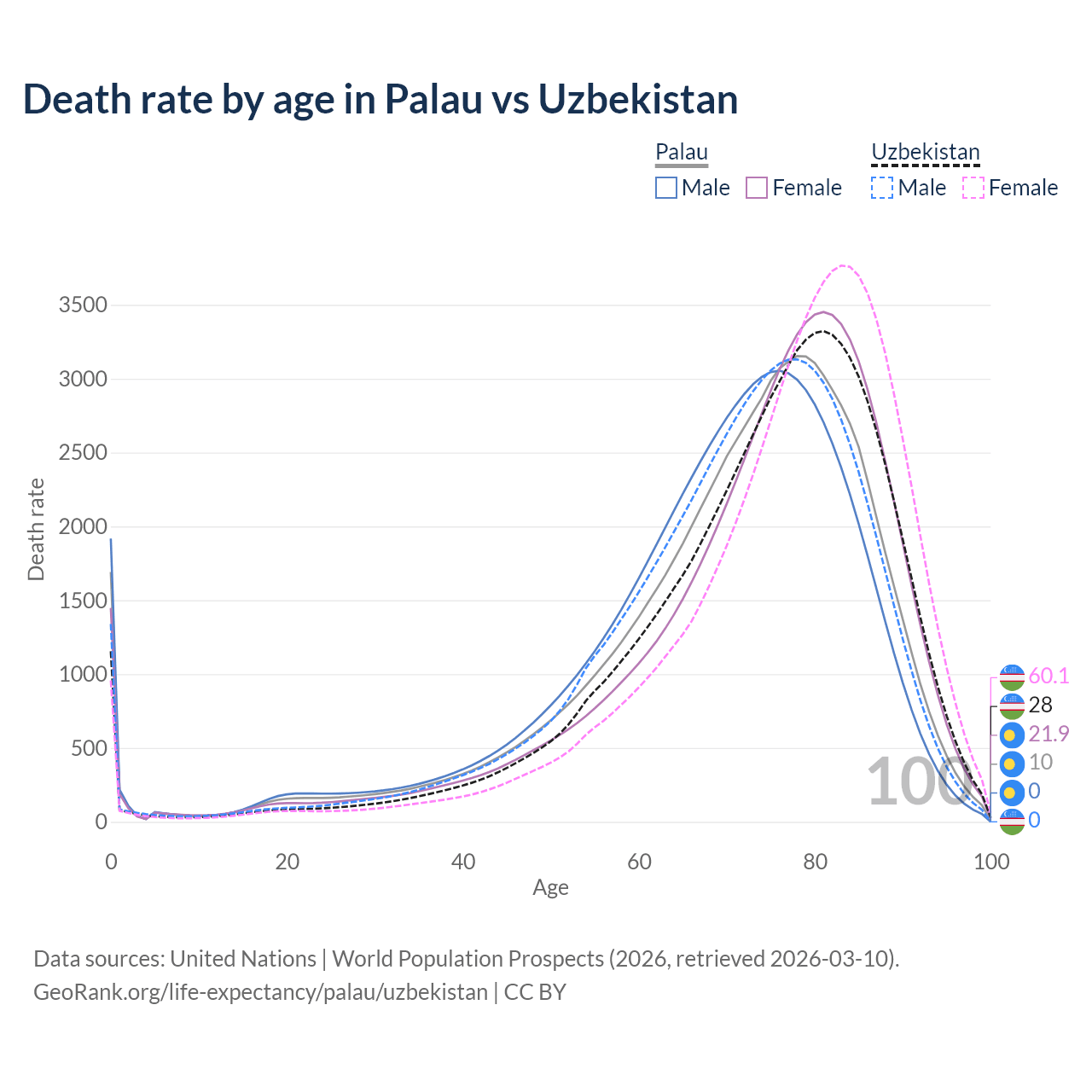 In Palau, the most common age of death is 78, compared to 81 in Uzbekistan. The median age of death is 73.8 in Palau and 76.4 in Uzbekistan, meaning only half of each cohort is expected to live past that age.
