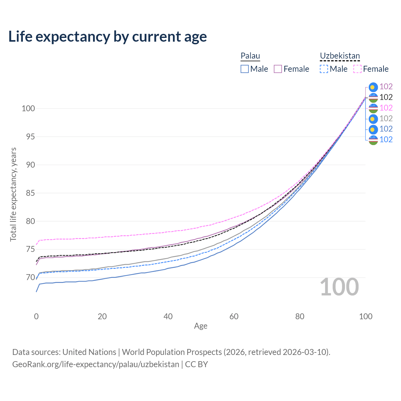 This life expectancy calculator shows the odds of living to 100, 95, 90, and below based on current age for both males and females in Palau and Uzbekistan, along with mean and median age of death. The calculations are based on the 2026 life tables (actuarial tables) from the UN World Population Prospects.