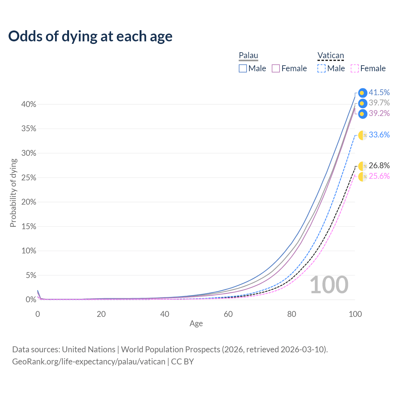 This life expectancy calculator shows the odds of living to 100, 95, 90, and below based on current age for both males and females in Palau and the Vatican, along with mean and median age of death. The calculations are based on the 2026 life tables (actuarial tables) from the UN World Population Prospects.