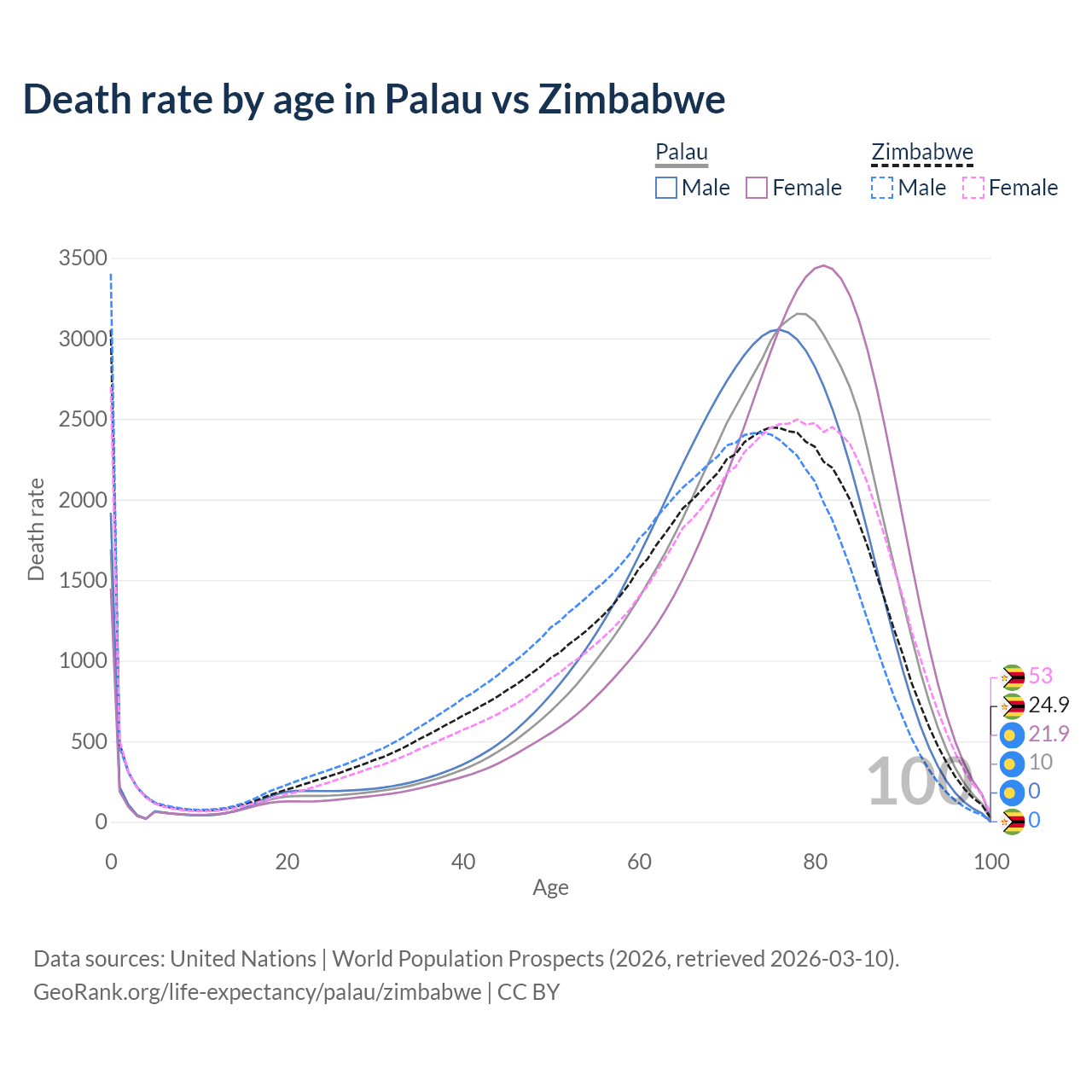 In Palau, the most common age of death is 78, compared to 0 in Zimbabwe. The median age of death is 73.8 in Palau and 68.8 in Zimbabwe, meaning only half of each cohort is expected to live past that age.