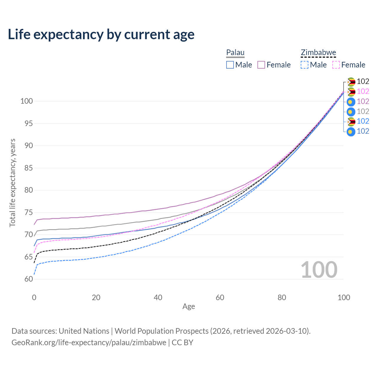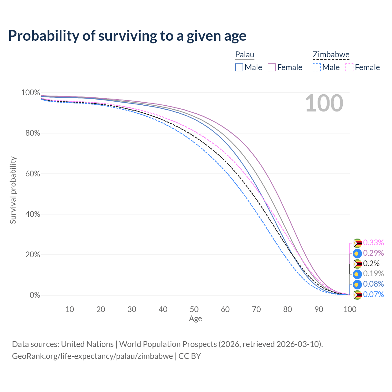 This life expectancy calculator shows the odds of living to 100, 95, 90, and below based on current age for both males and females in Palau and Zimbabwe, along with mean and median age of death. The calculations are based on the 2026 life tables (actuarial tables) from the UN World Population Prospects.