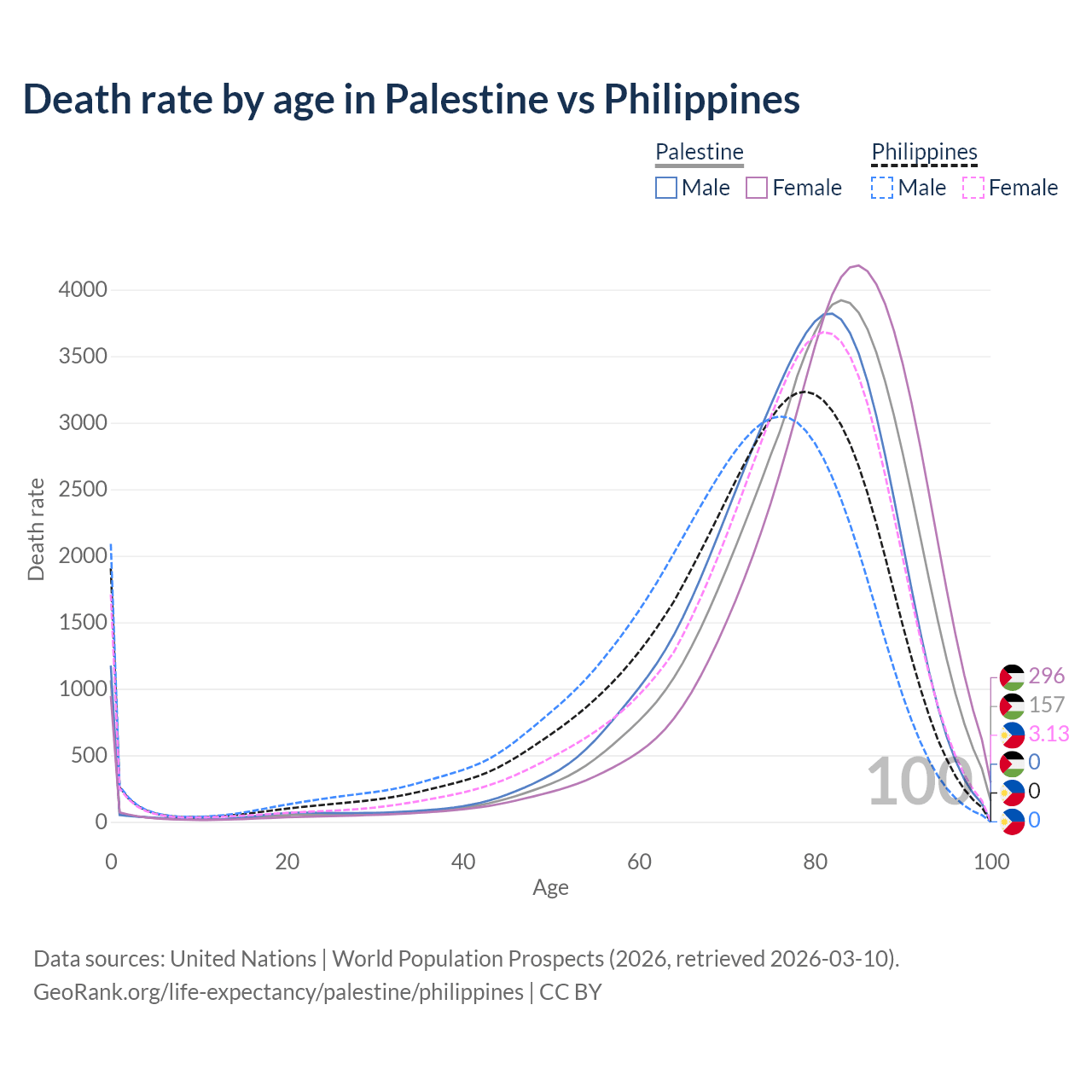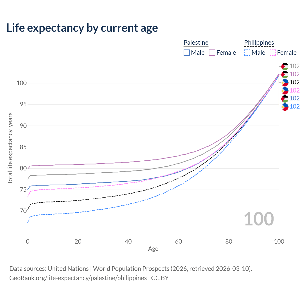 This life expectancy calculator shows the odds of living to 100, 95, 90, and below based on current age for both males and females in Palestine and the Philippines, along with mean and median age of death. The calculations are based on the 2026 life tables (actuarial tables) from the UN World Population Prospects.