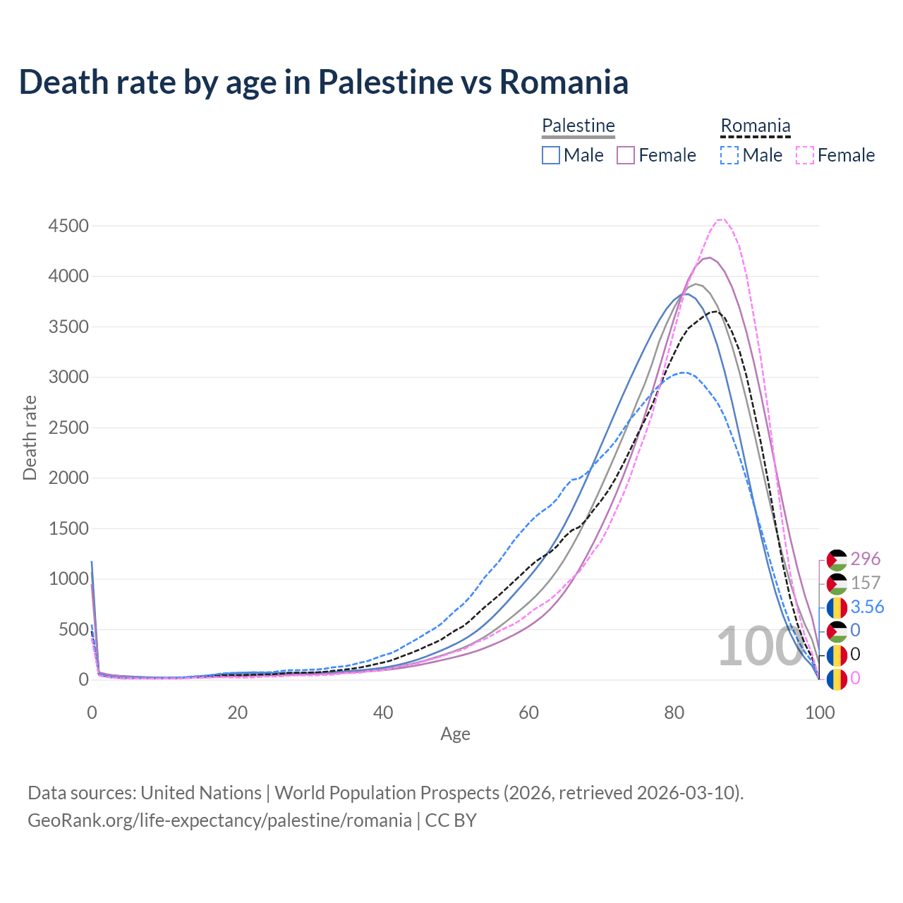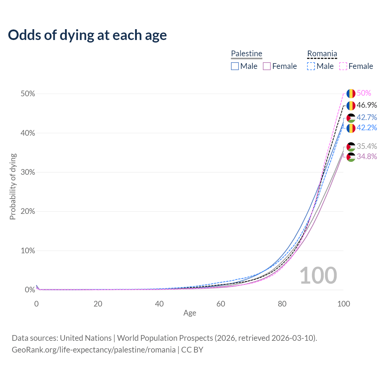 This life expectancy calculator shows the odds of living to 100, 95, 90, and below based on current age for both males and females in Palestine and Romania, along with mean and median age of death. The calculations are based on the 2026 life tables (actuarial tables) from the UN World Population Prospects.