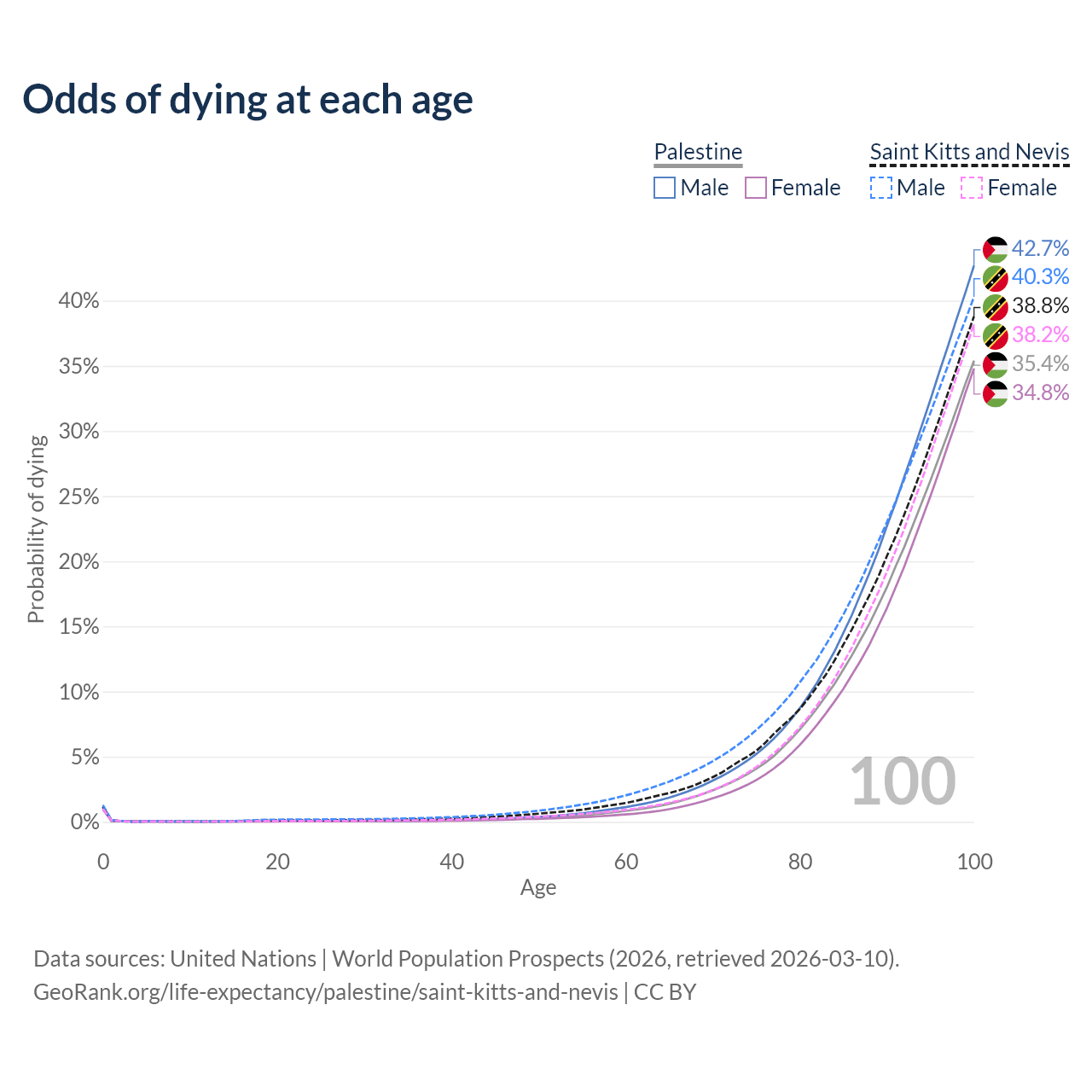This life expectancy calculator shows the odds of living to 100, 95, 90, and below based on current age for both males and females in Palestine and Saint Kitts and Nevis, along with mean and median age of death. The calculations are based on the 2026 life tables (actuarial tables) from the UN World Population Prospects.