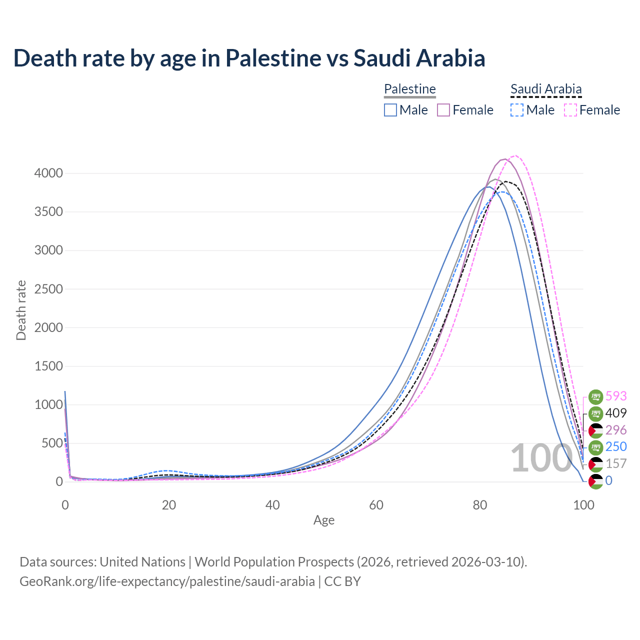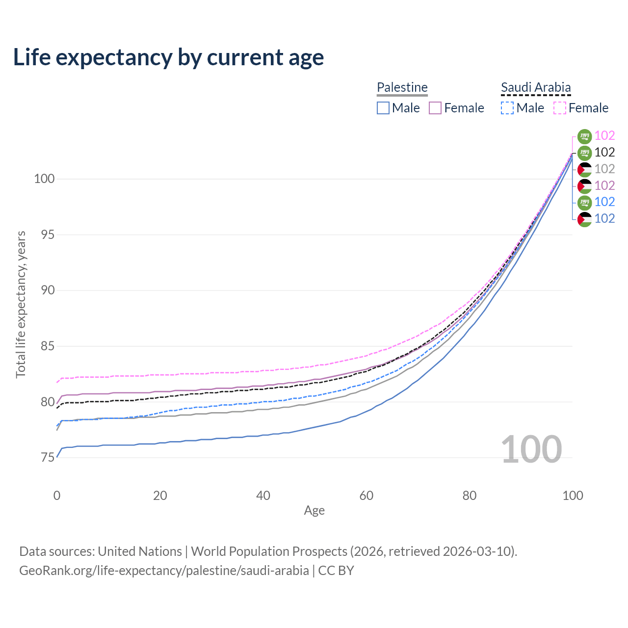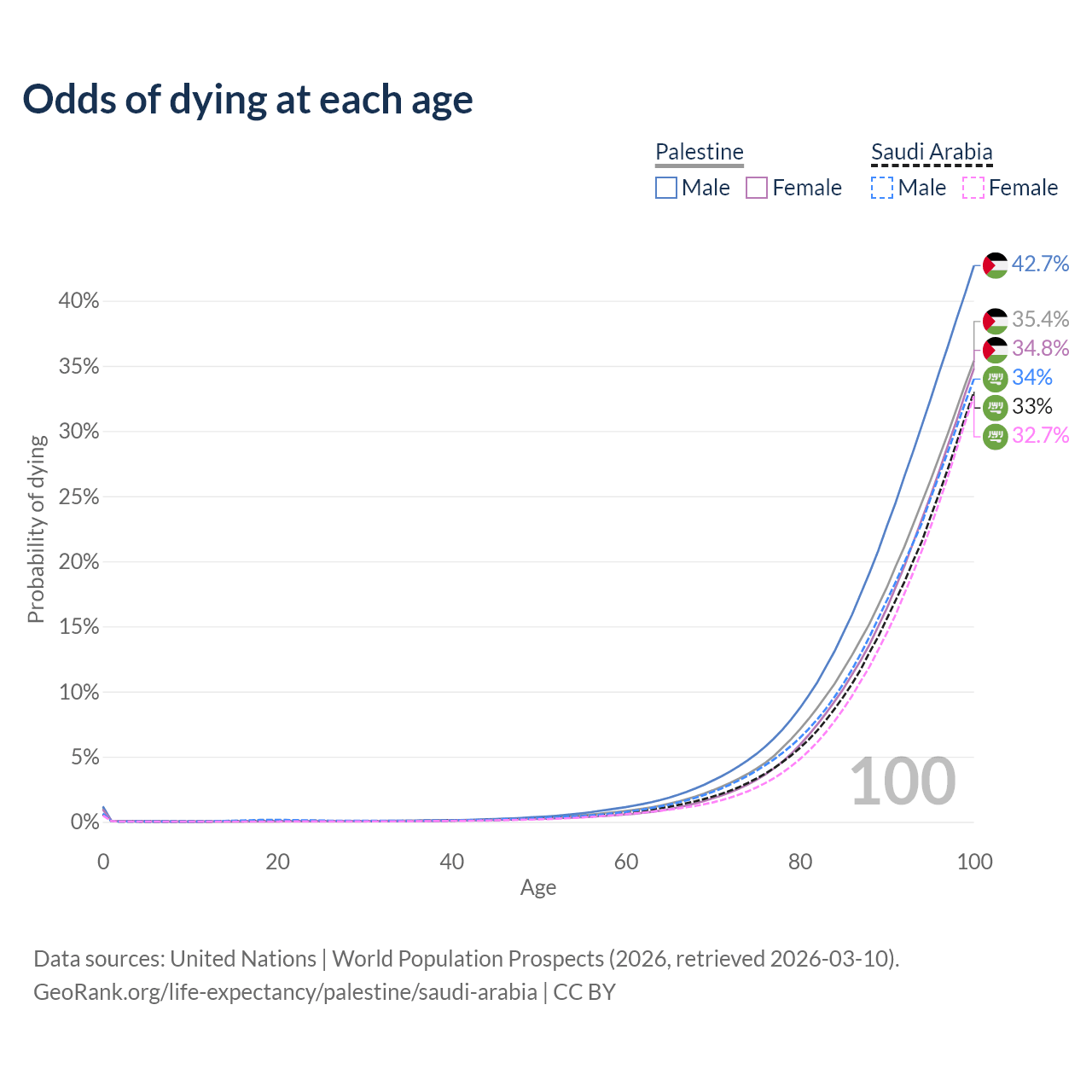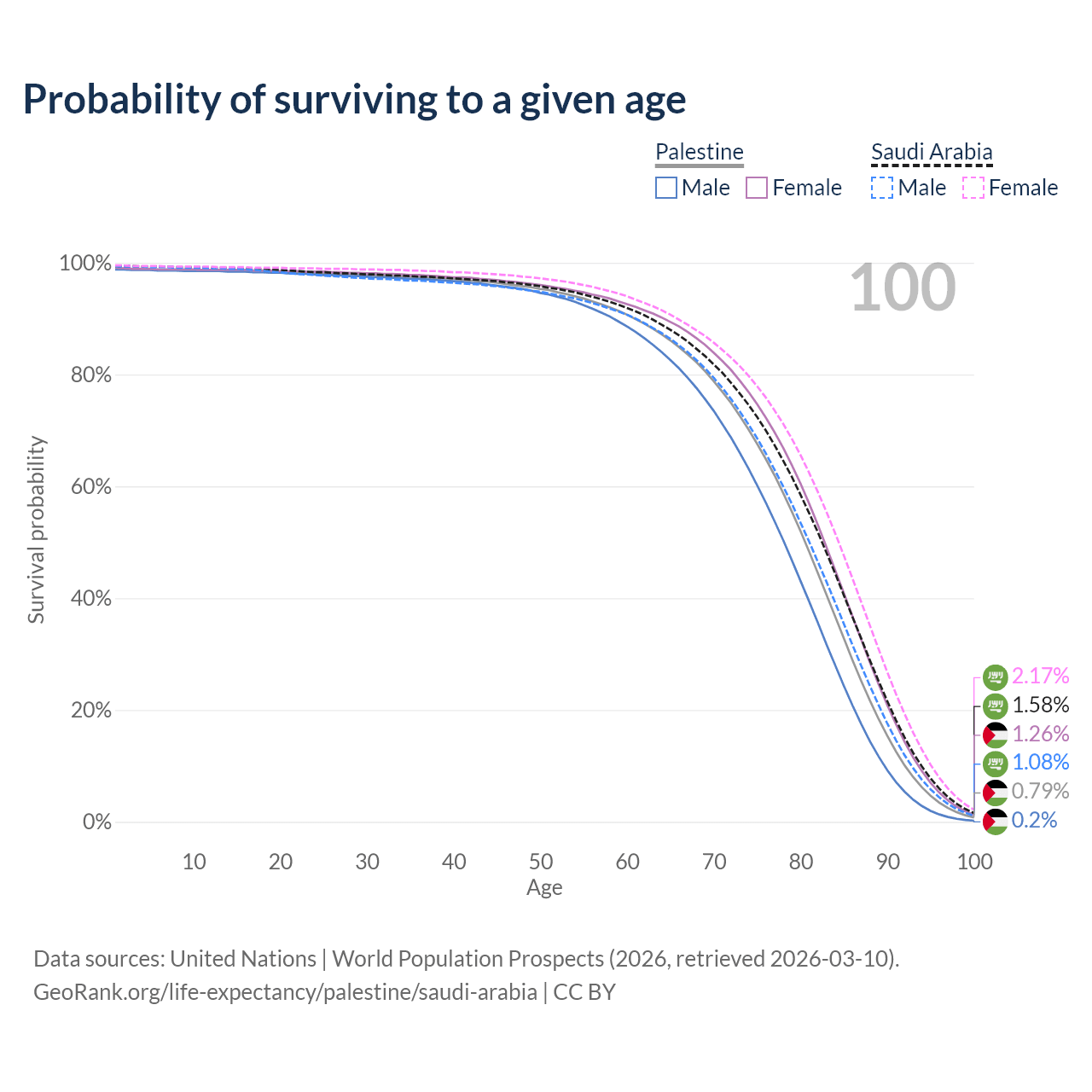 This life expectancy calculator shows the odds of living to 100, 95, 90, and below based on current age for both males and females in Palestine and Saudi Arabia, along with mean and median age of death. The calculations are based on the 2026 life tables (actuarial tables) from the UN World Population Prospects.