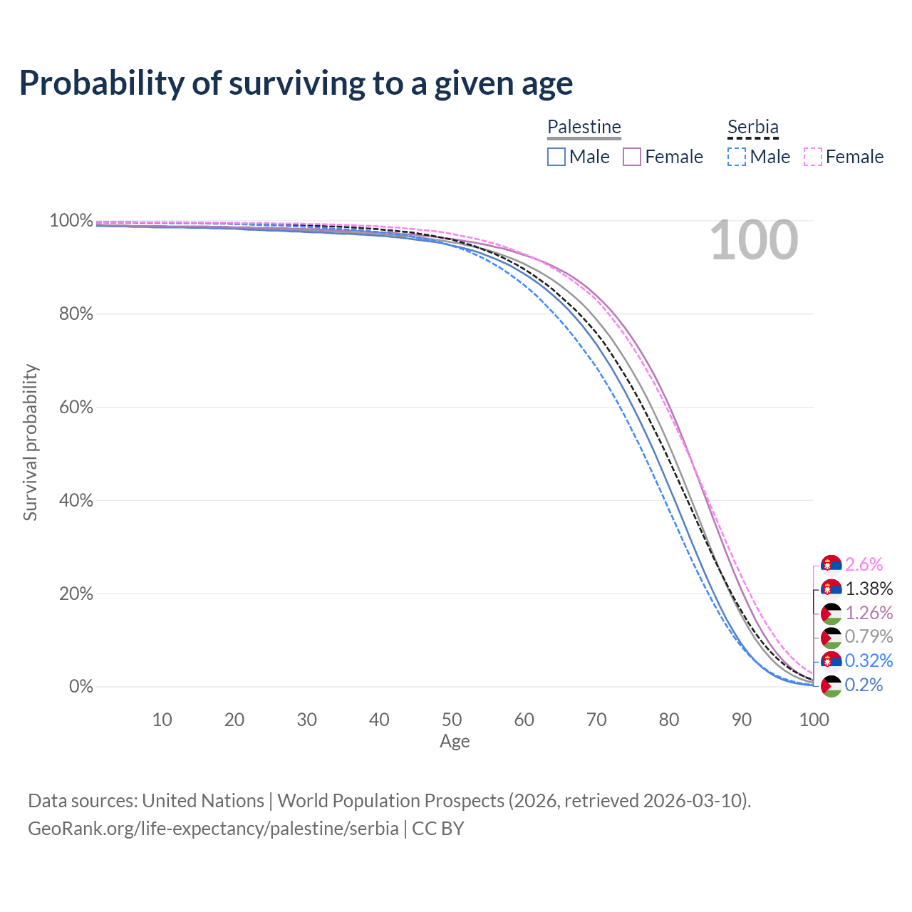 This life expectancy calculator shows the odds of living to 100, 95, 90, and below based on current age for both males and females in Palestine and Serbia, along with mean and median age of death. The calculations are based on the 2026 life tables (actuarial tables) from the UN World Population Prospects.