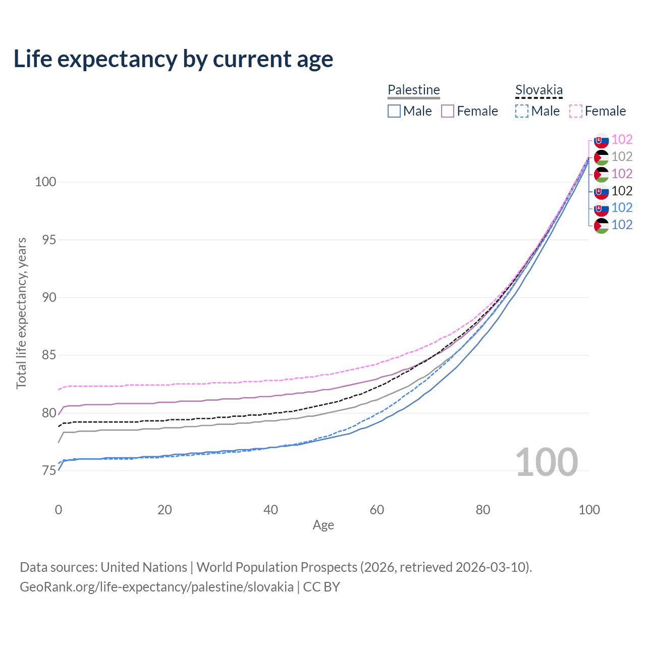 This life expectancy calculator shows the odds of living to 100, 95, 90, and below based on current age for both males and females in Palestine and Slovakia, along with mean and median age of death. The calculations are based on the 2026 life tables (actuarial tables) from the UN World Population Prospects.