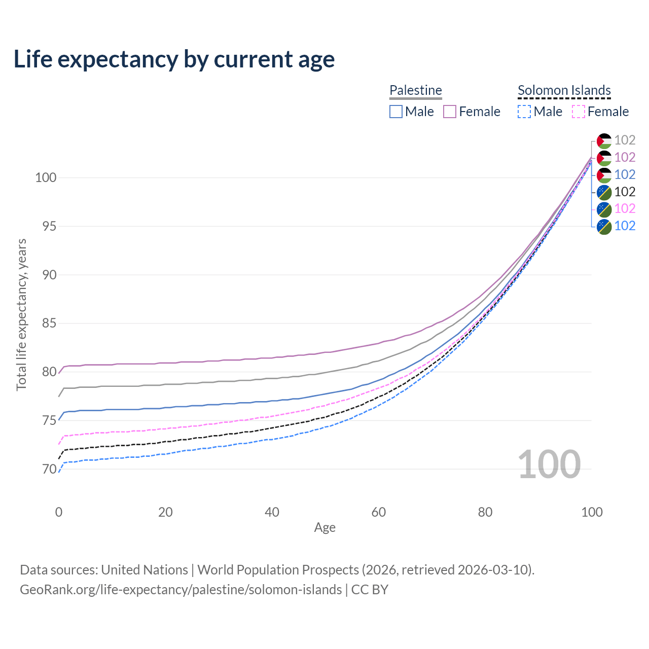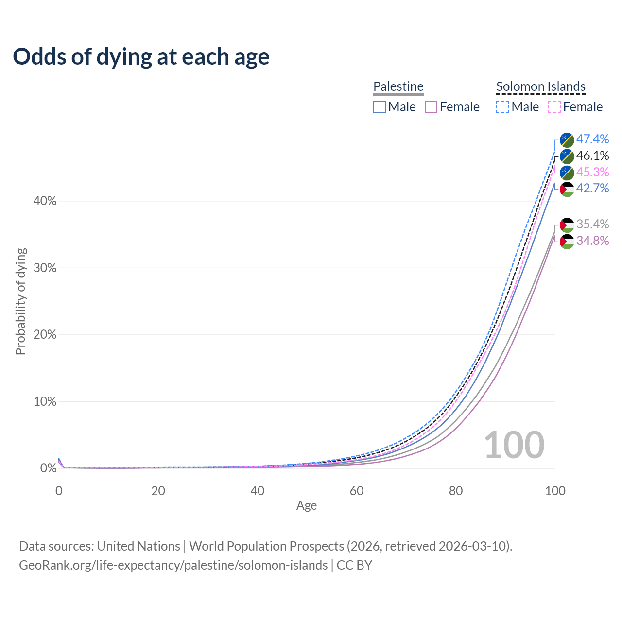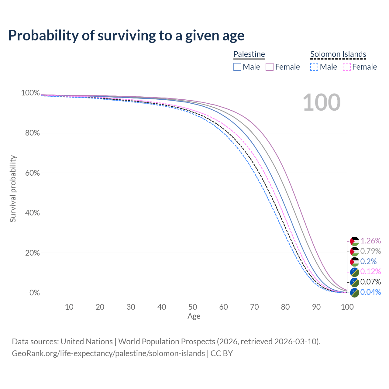 This life expectancy calculator shows the odds of living to 100, 95, 90, and below based on current age for both males and females in Palestine and the Solomon Islands, along with mean and median age of death. The calculations are based on the 2026 life tables (actuarial tables) from the UN World Population Prospects.