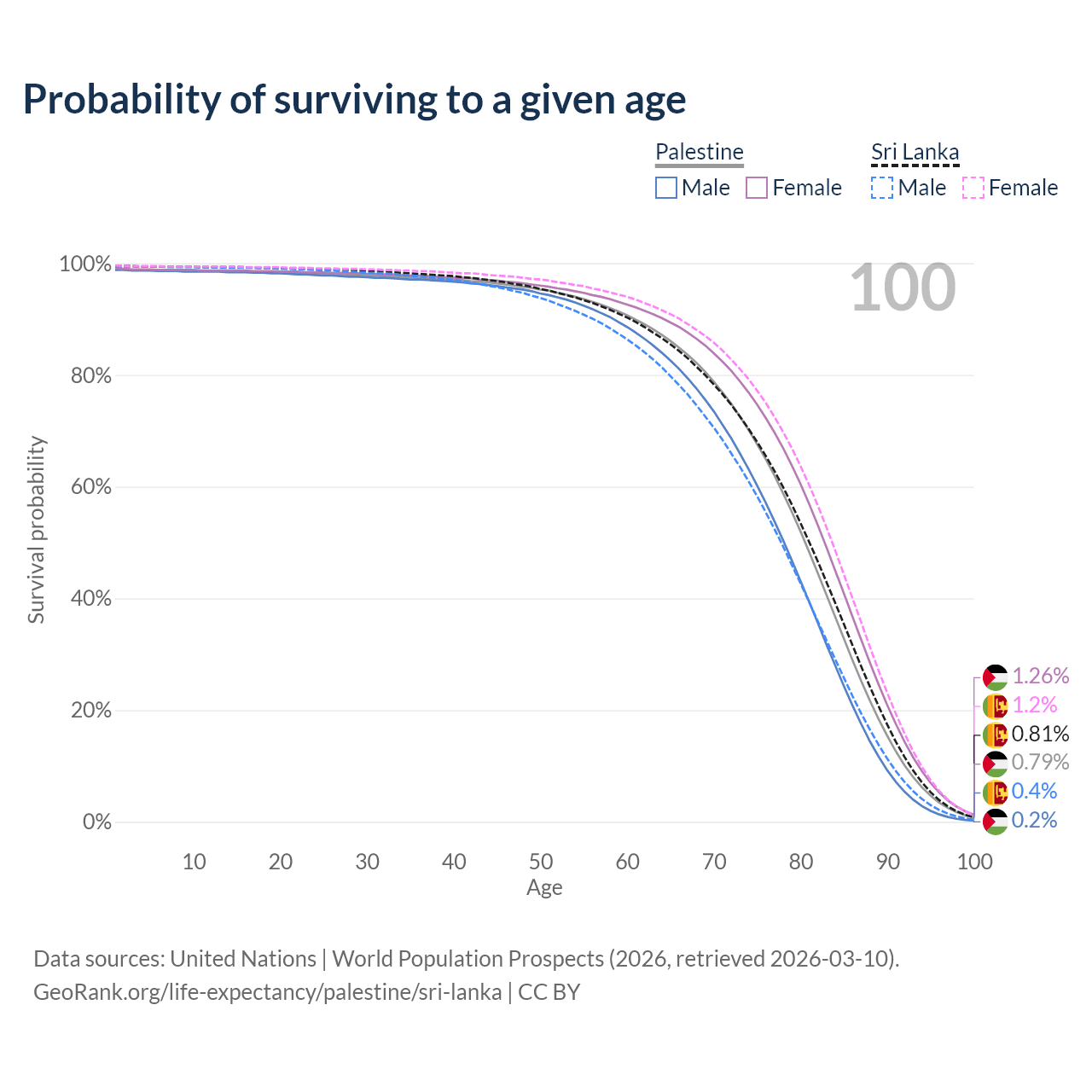 This life expectancy calculator shows the odds of living to 100, 95, 90, and below based on current age for both males and females in Palestine and Sri Lanka, along with mean and median age of death. The calculations are based on the 2026 life tables (actuarial tables) from the UN World Population Prospects.