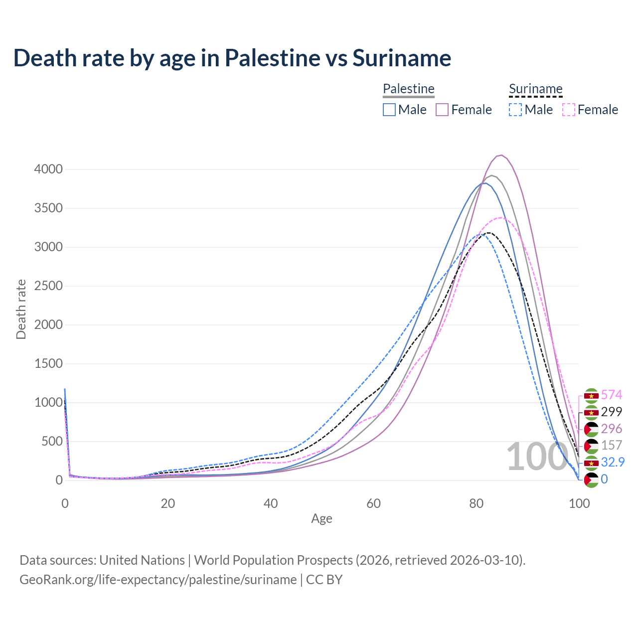 In Palestine, the most common age of death is 83, compared to 82 in Suriname. The median age of death is 80.5 in Palestine and 78 in Suriname, meaning only half of each cohort is expected to live past that age.