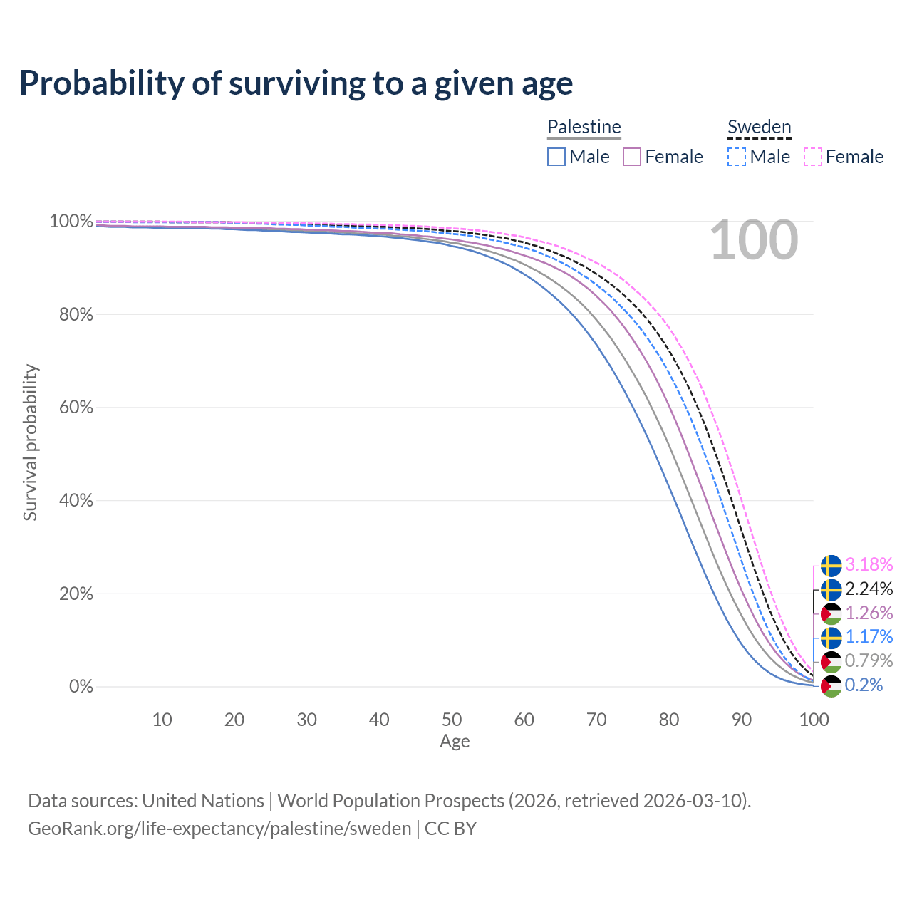 This life expectancy calculator shows the odds of living to 100, 95, 90, and below based on current age for both males and females in Palestine and Sweden, along with mean and median age of death. The calculations are based on the 2026 life tables (actuarial tables) from the UN World Population Prospects.
