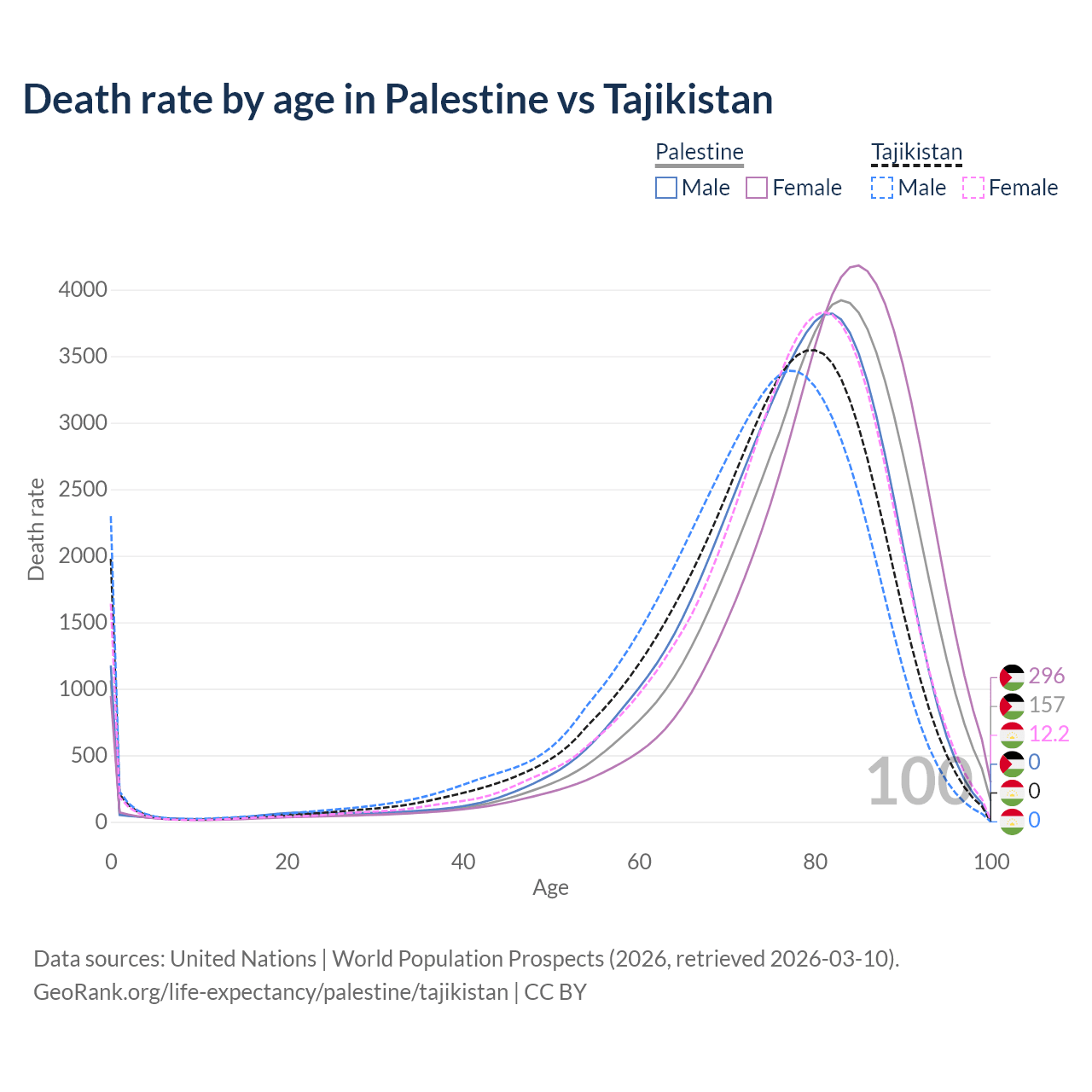 This life expectancy calculator shows the odds of living to 100, 95, 90, and below based on current age for both males and females in Palestine and Tajikistan, along with mean and median age of death. The calculations are based on the 2026 life tables (actuarial tables) from the UN World Population Prospects.