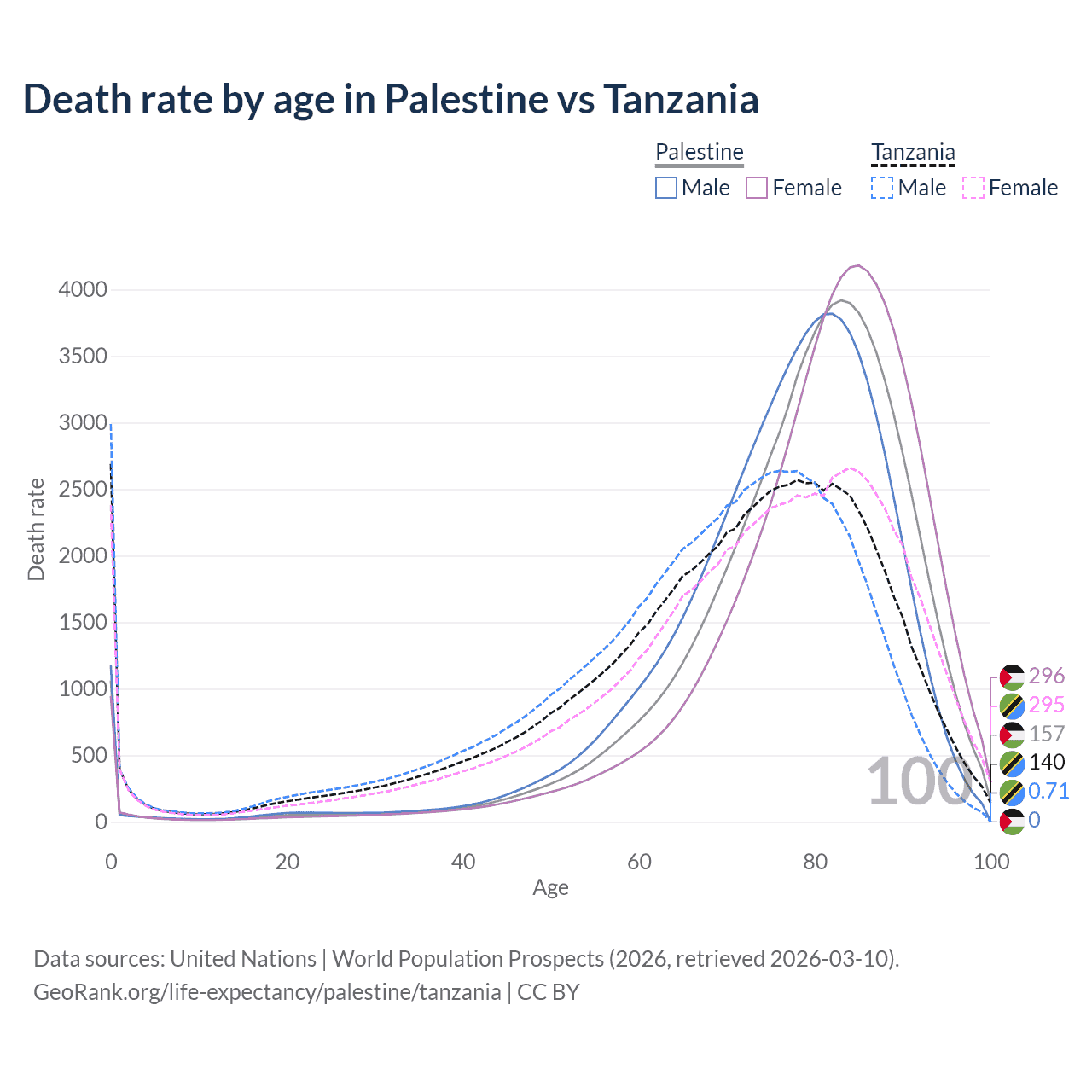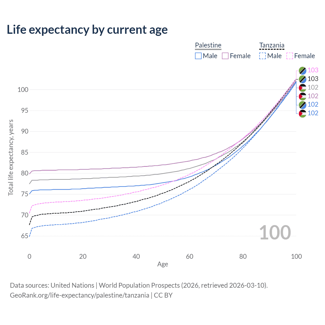 The average life expectancy at birth is 77.4 years in Palestine vs 67.6 in Tanzania. Palestine is ranked 70/197 by life expectancy, and Tanzania is 155/197. In Palestine, the life expectancy is 75 years for males and 79.8 years for females. In Tanzania, it's 64.8 years for males and 70.4 years for females.