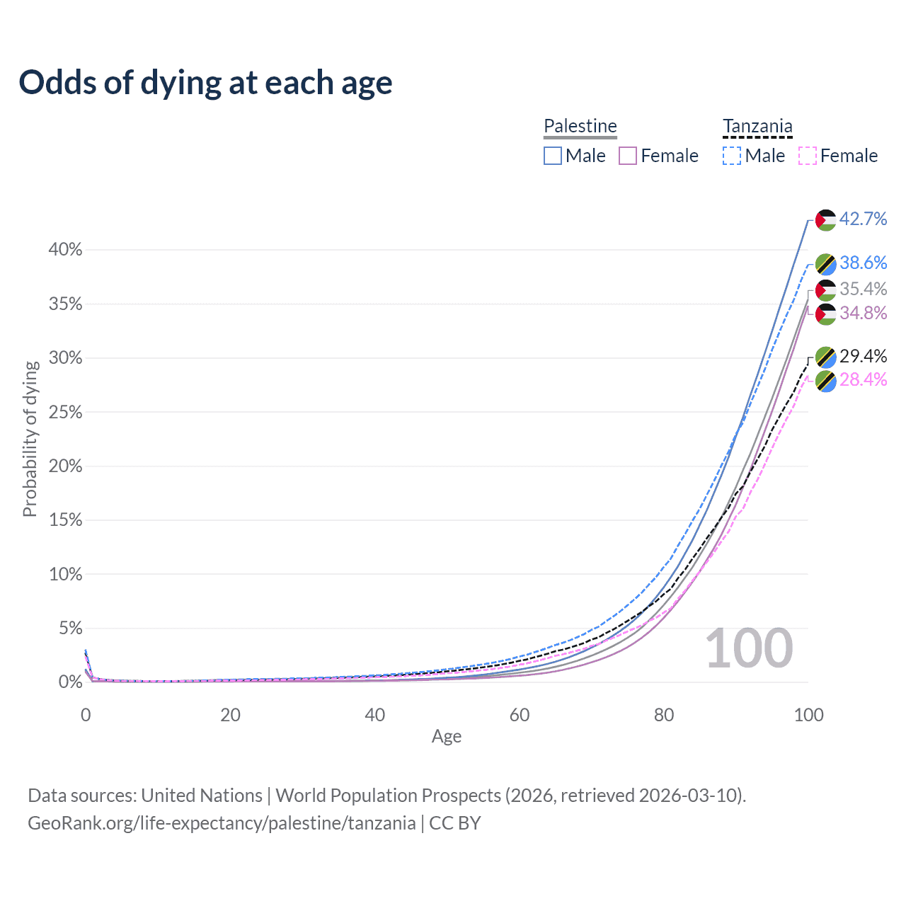 This life expectancy calculator shows the odds of living to 100, 95, 90, and below based on current age for both males and females in Palestine and Tanzania, along with mean and median age of death. The calculations are based on the 2026 life tables (actuarial tables) from the UN World Population Prospects.