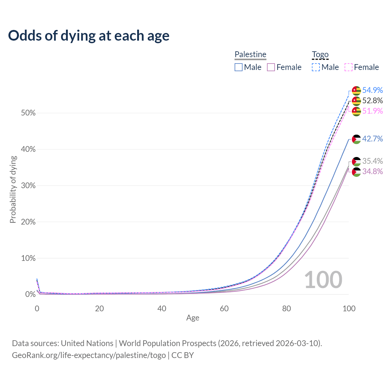 This life expectancy calculator shows the odds of living to 100, 95, 90, and below based on current age for both males and females in Palestine and Togo, along with mean and median age of death. The calculations are based on the 2026 life tables (actuarial tables) from the UN World Population Prospects.
