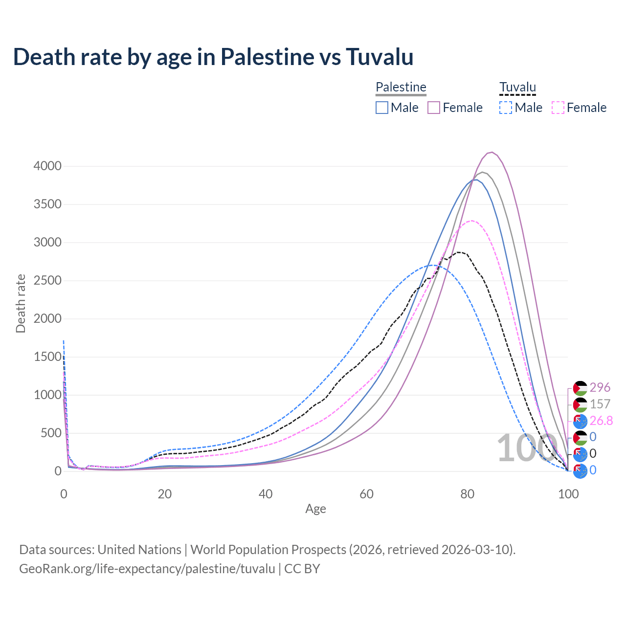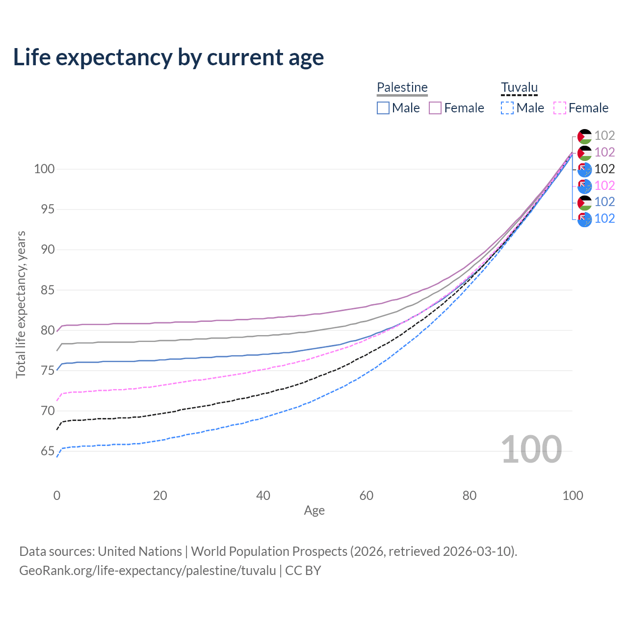 This life expectancy calculator shows the odds of living to 100, 95, 90, and below based on current age for both males and females in Palestine and Tuvalu, along with mean and median age of death. The calculations are based on the 2026 life tables (actuarial tables) from the UN World Population Prospects.