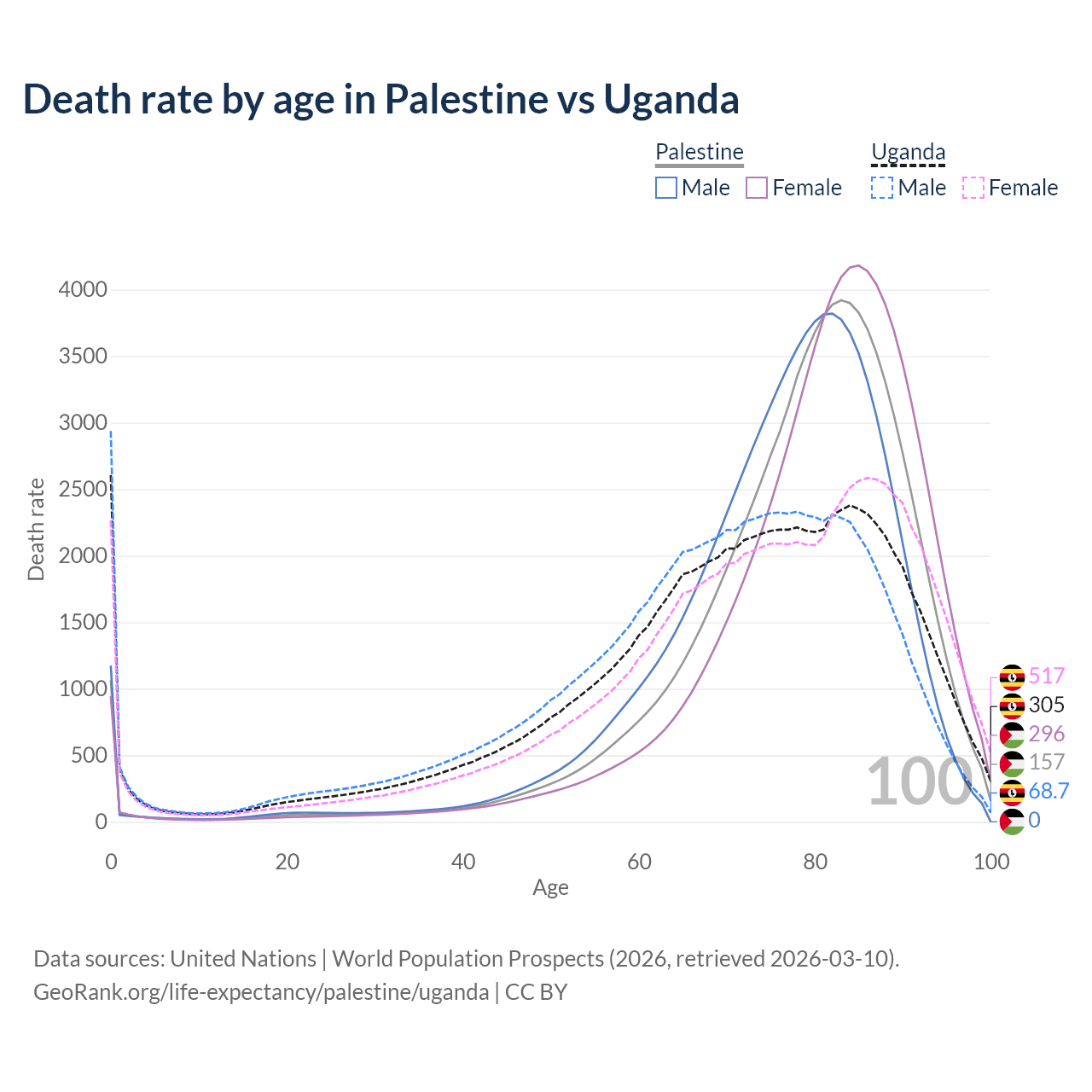 In Palestine, the most common age of death is 83, compared to 0 in Uganda. The median age of death is 80.5 in Palestine and 73.3 in Uganda, meaning only half of each cohort is expected to live past that age.